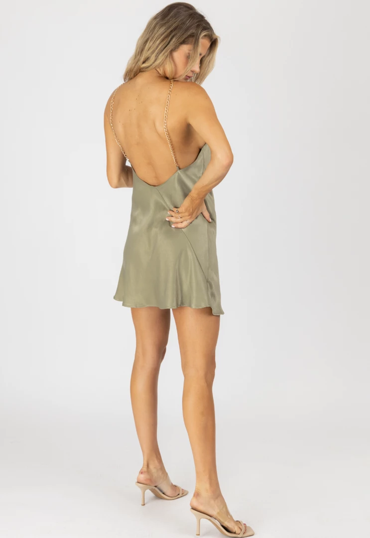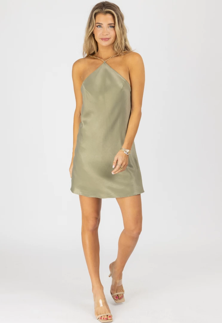 Halterneck, Chain strap detail, Open back, Satinlike, Mini dress, Adjustable straps