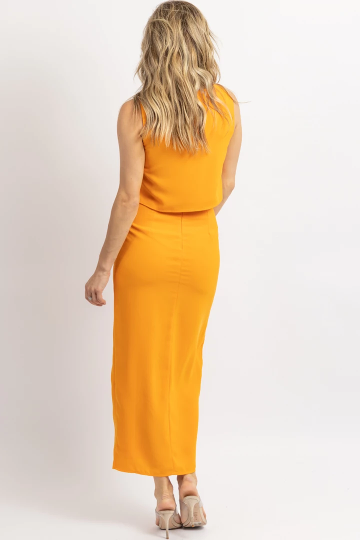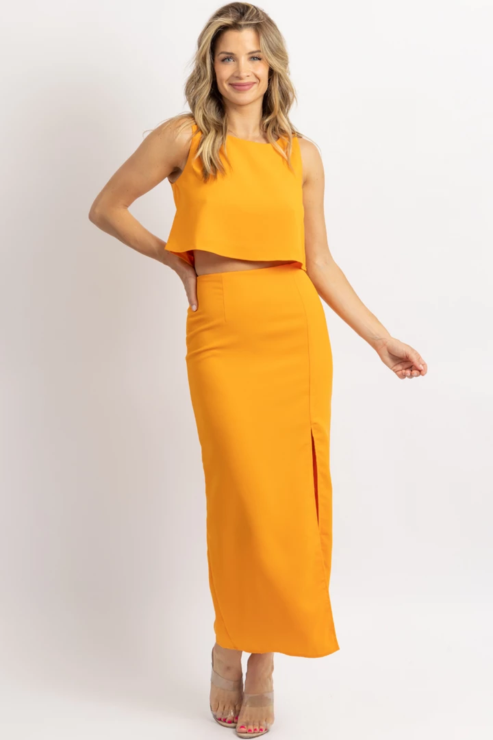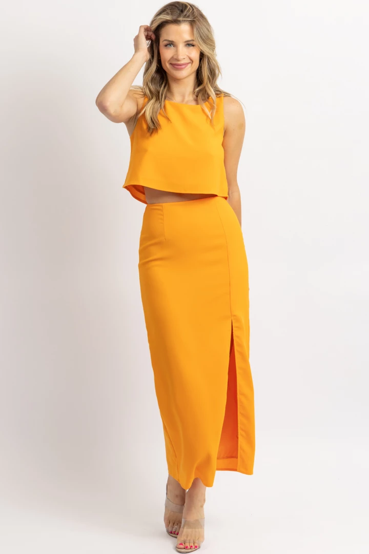 Sold together, Midi skirt, High rise with zipper, Sleeveless crop tank, Relaxed top