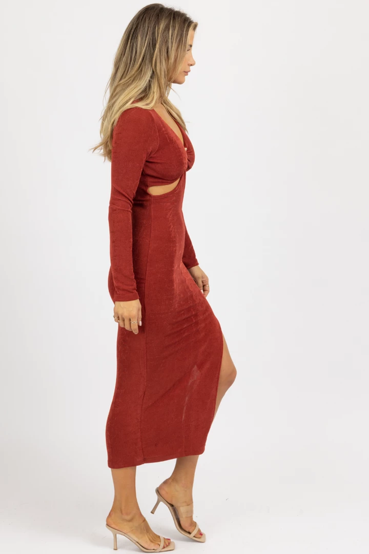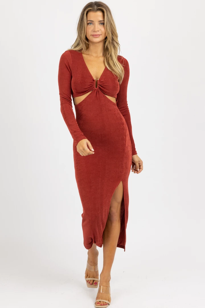 Long sleeves, Fitted, Slinky, Side slit, Cutout sides, U-ring detail, Midi