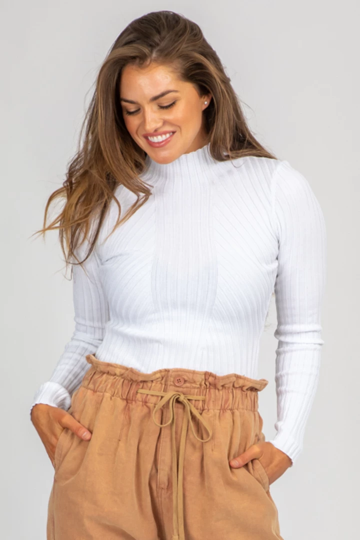 Asymmetrical ribbed detail, Turtleneck, Snap closure, Long sleeves