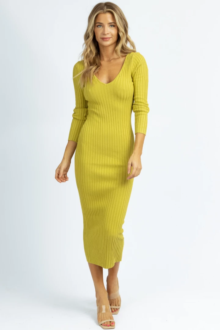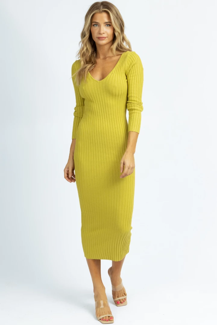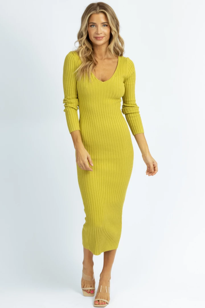 V-neck, V-back, Thick knit ribbed, Long sleeves, Form fitting with stretch, Midi length
