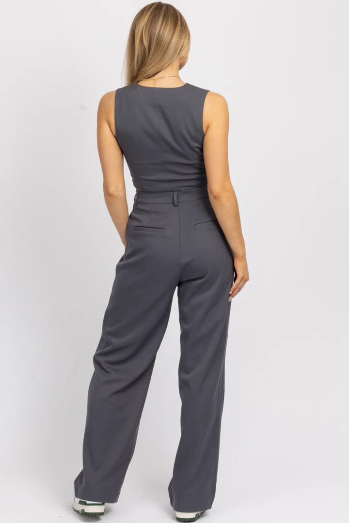 Sold together, Button front vest top, Cropped, Sleeveless, High rise trousers, Button front, Wide leg, Front pleats