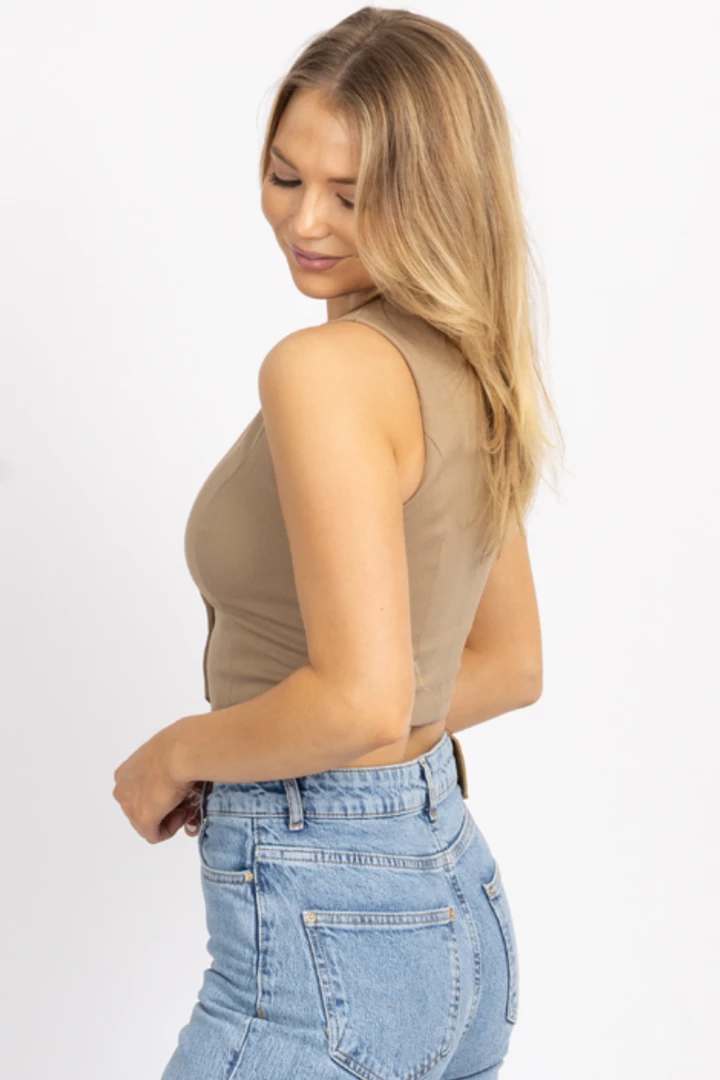 Sleeveless, Button front, Slight crop, V-neckline