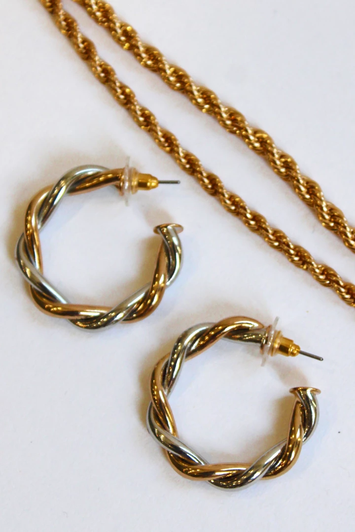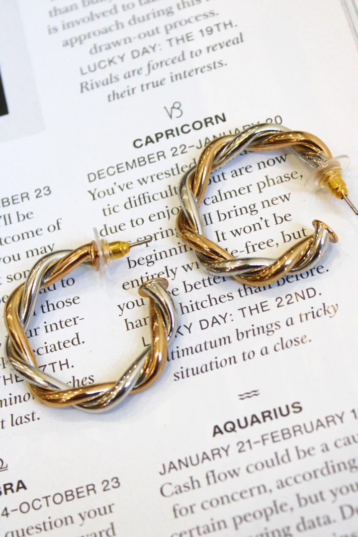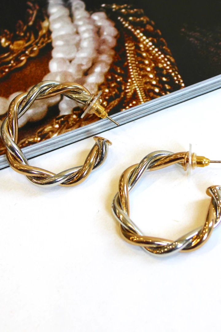 Two toned, Silver + gold twisted hoop, Open back hoop, Length: 1.5″