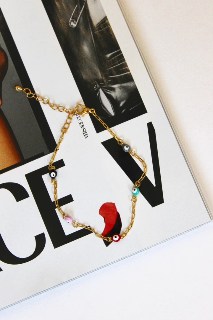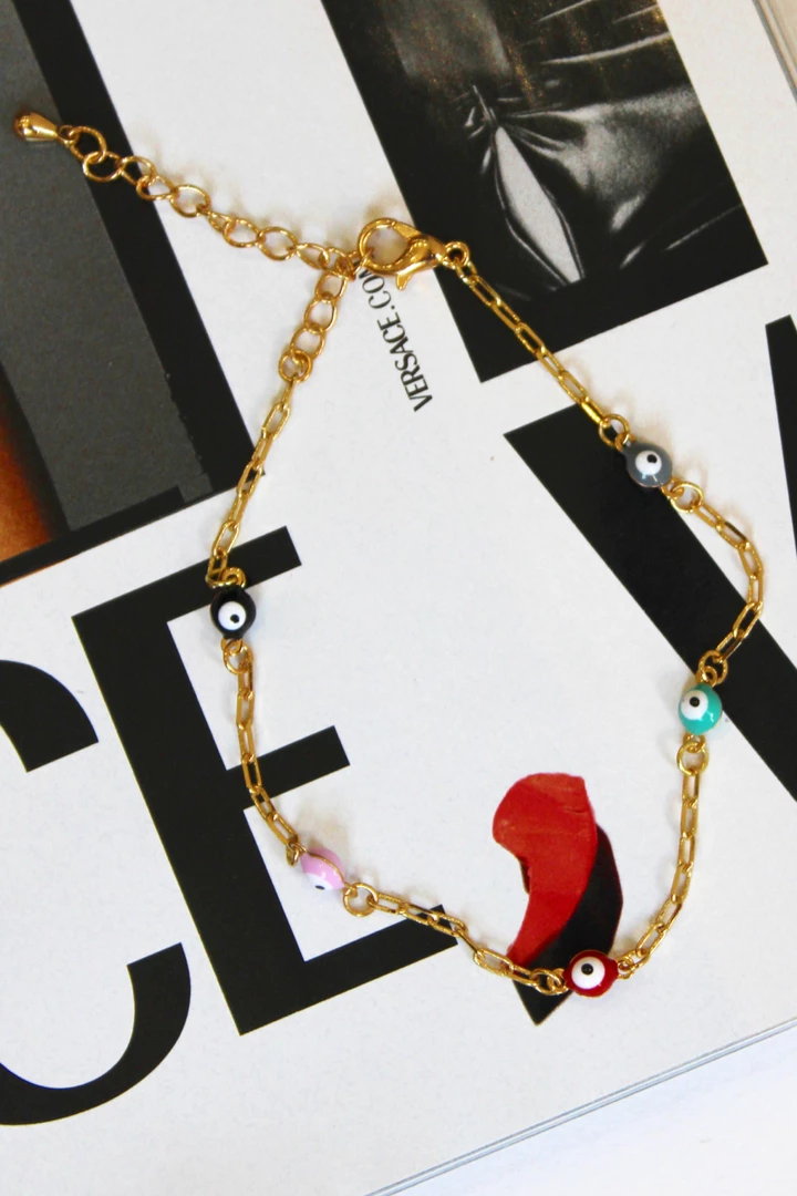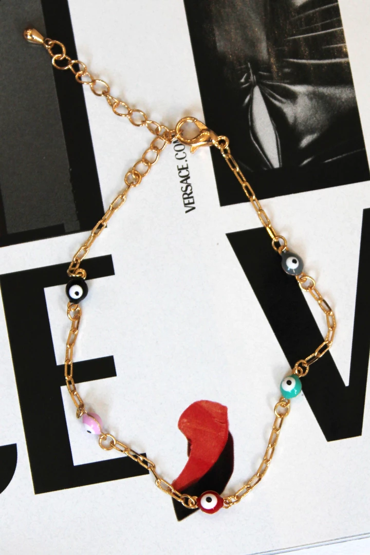 Gold chain, Adjustable clasp, Multicolor evil eye charm detail,