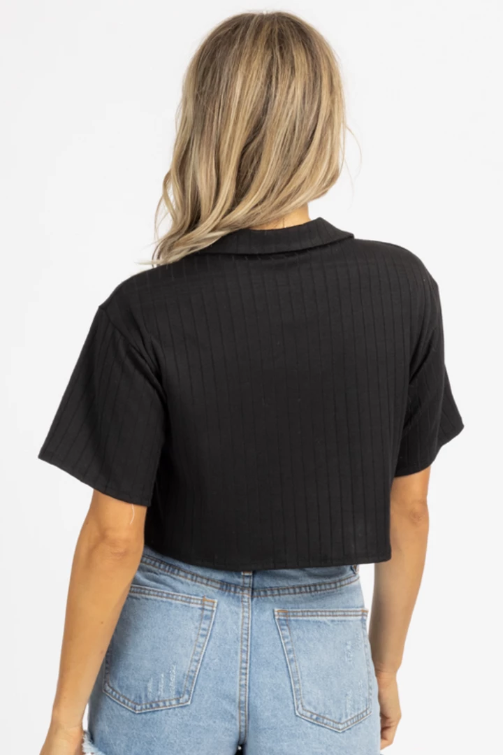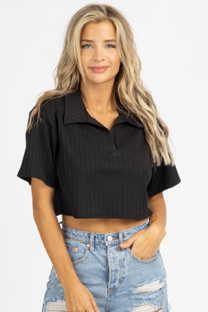 Ribbed, Relaxed fit, Short sleeves, Collared, Cropped, V-neck