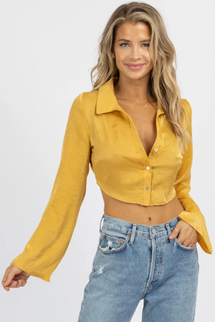Satin, Button front, Collared, Long sleeves, Bell sleeved, Open back with tie detail