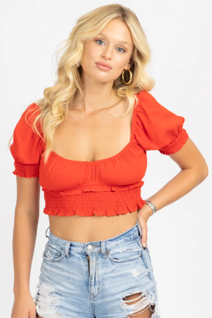 Cropped, Smocked detail, Puff short sleeves, Sweetheart neckline
