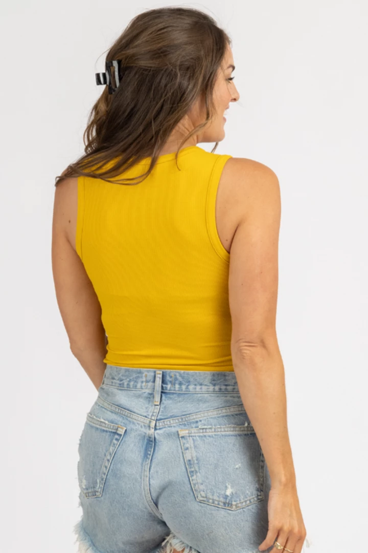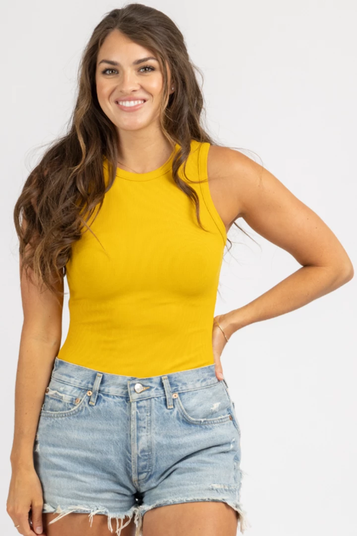 Ribbed, Round neck, Sleeveless, Snap bottom, Thong bottom