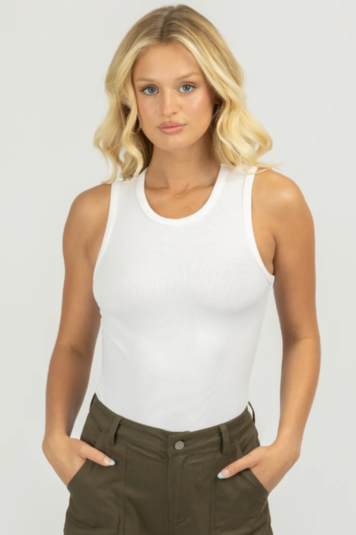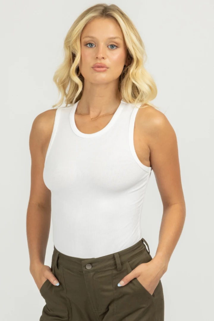 Ribbed, Round neck, Sleeveless, Snap bottom, Thong bottom
