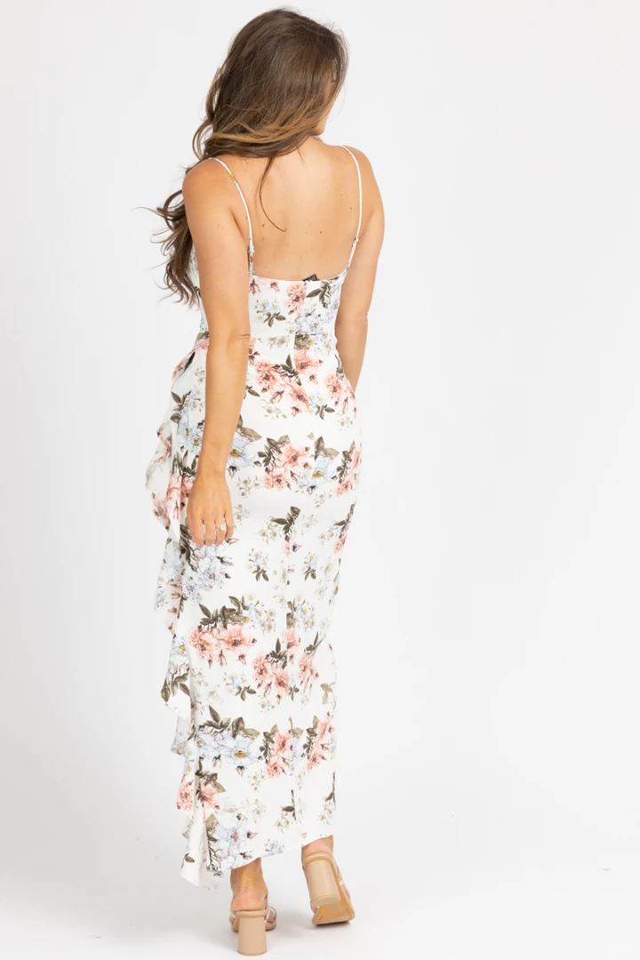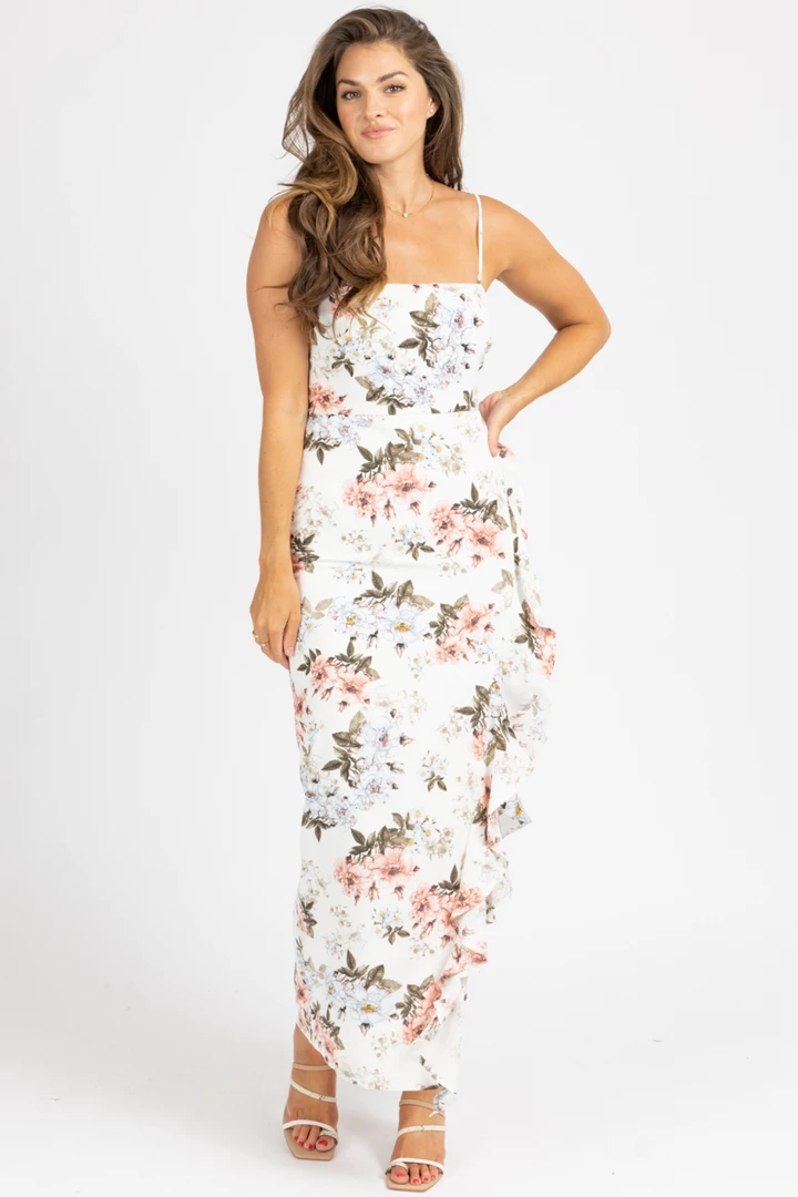 Straight neckline, Spaghetti straps, Floral, Side slit with ruffle, Midi length