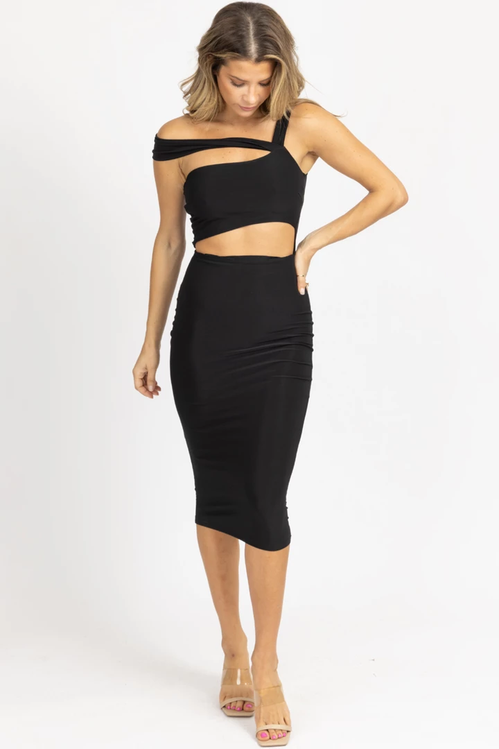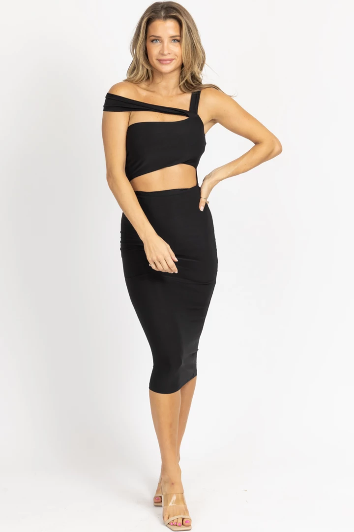 Sleeveless, Cross-neck strap, Front cutout, Midi length, Bodycon