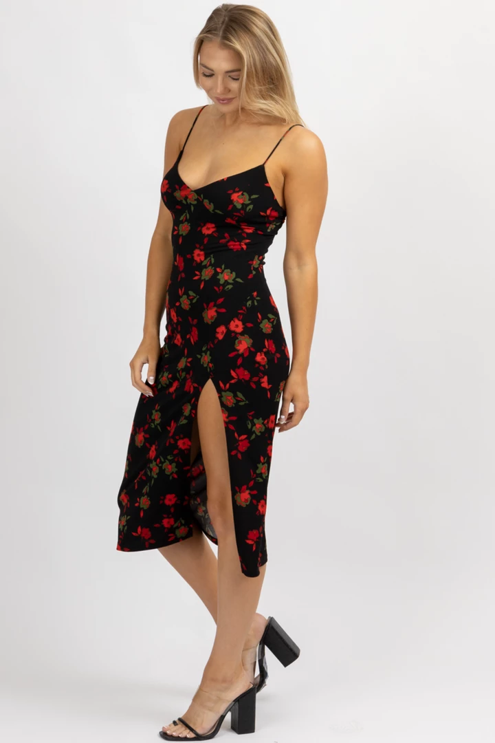 Midi length, Side slit, Spaghetti straps, Fitted, Floral print