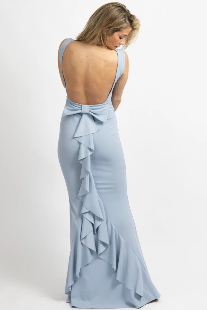 Sleeveless, High neck, Scoop back with bow detail, Maxi length, Form fitting