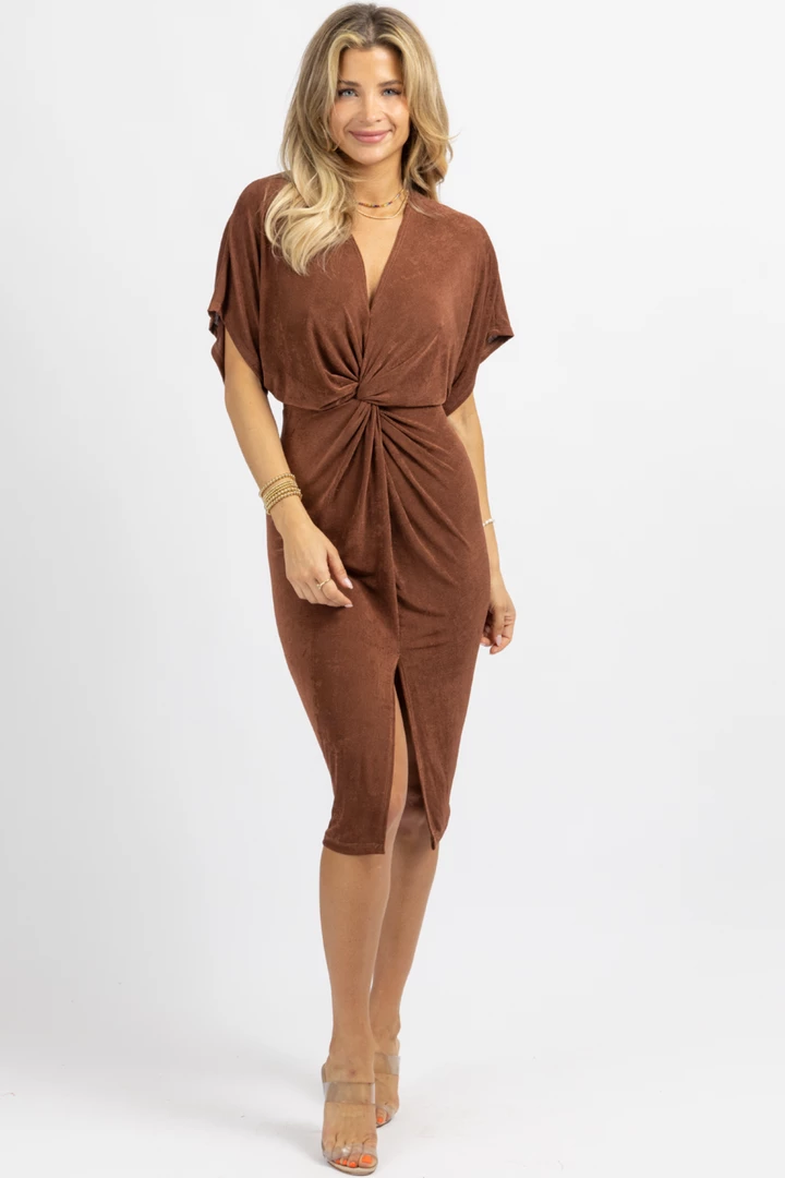 Front twist detail, Midi length, Slinky, V-neck, Short sleeves, Asymmetric hem