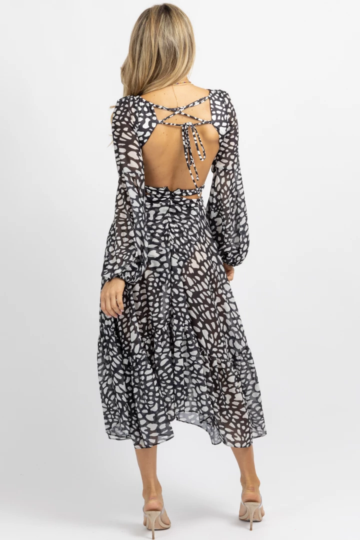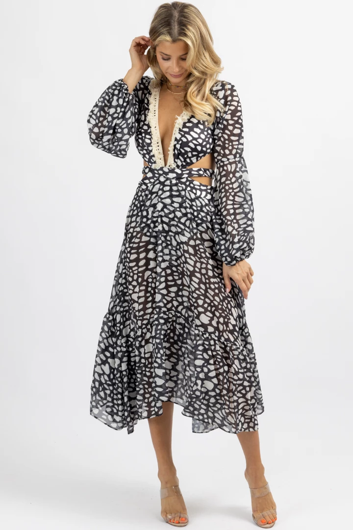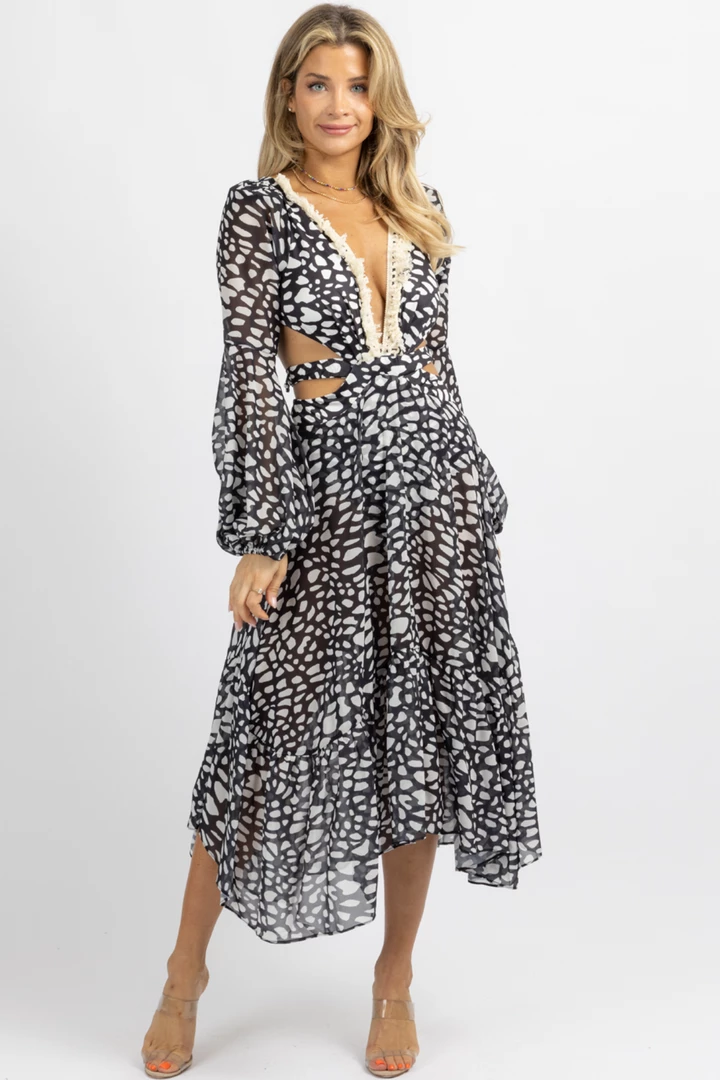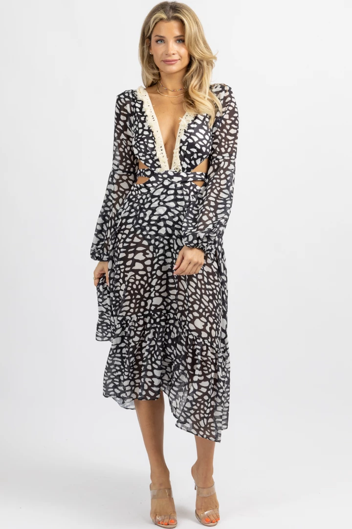 Maxi length, V-neckline, Long sleeves, Fringe trim neckline, Animal print, Tie back, Open sides