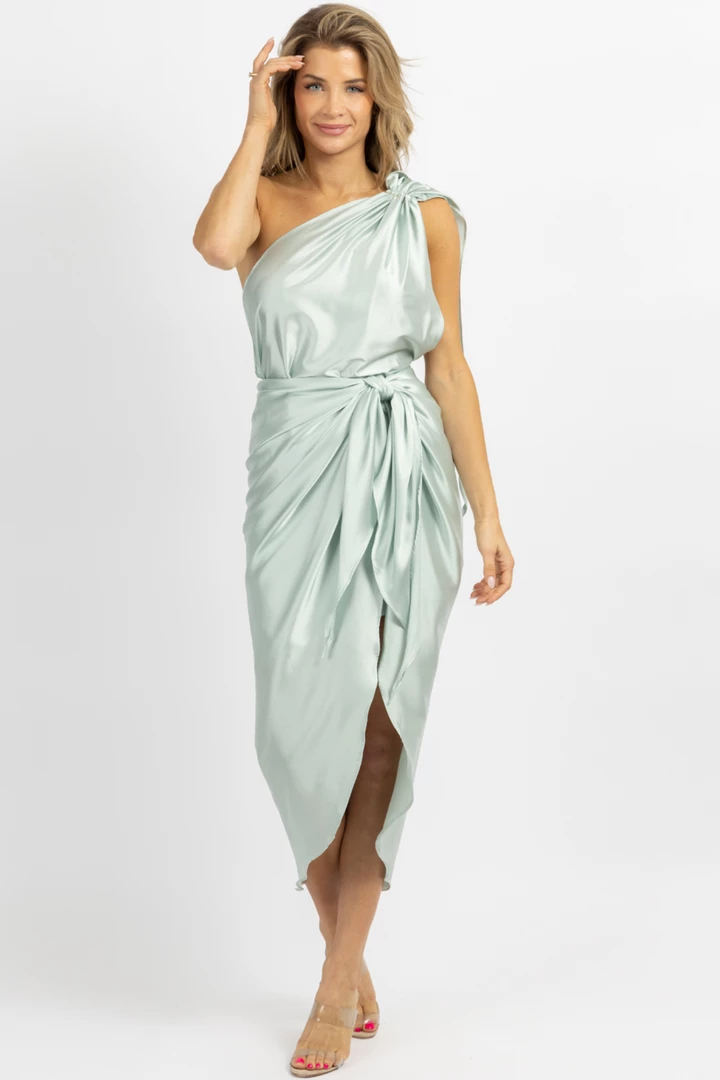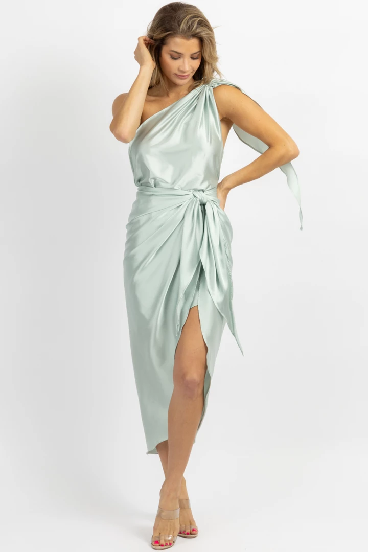 Midi length, One shoulder with self-tie front wrap, Asymmetric, Side slit, Adjustable one shoulder detail