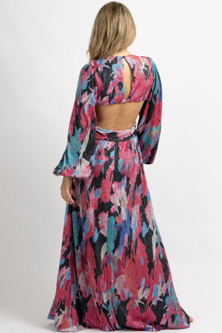 Metallic, Patterned, Maxi length, Long sleeves, O-ring detail with pearls, Cutout detail, Open back