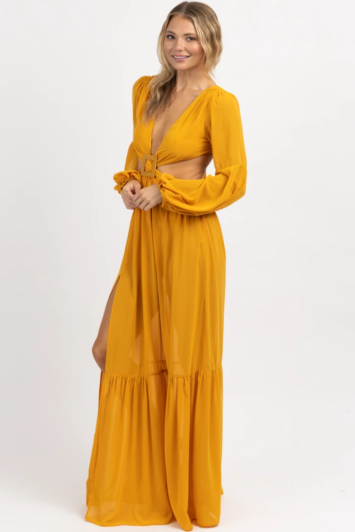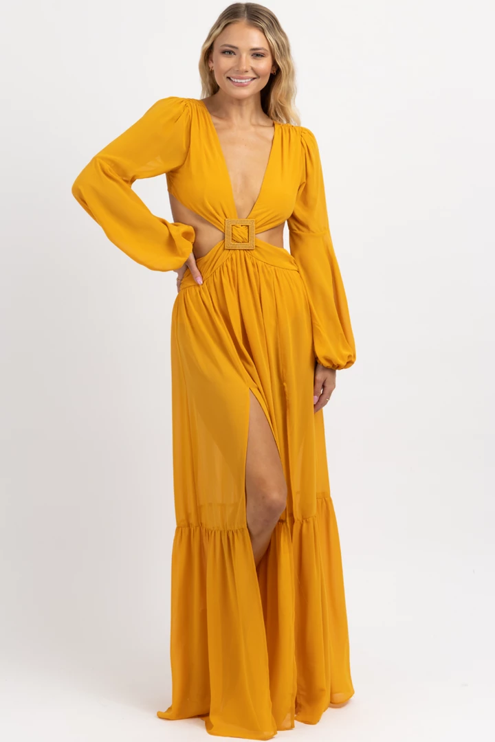 High side slits, Square trim buckle detail, Long sleeves, Built in leotard, Cutouts, Self-tie back