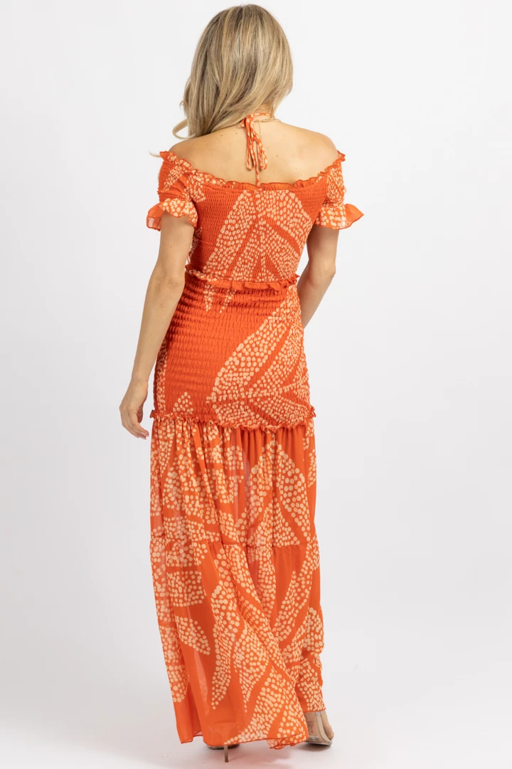 Midi length, Smocked, Self tie ruche, Open front, Short puff sleeves