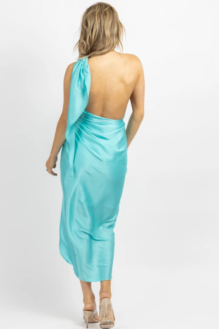 Midi length, One shoulder with self-tie front wrap, Asymmetric, Side slit, Adjustable one shoulder detail