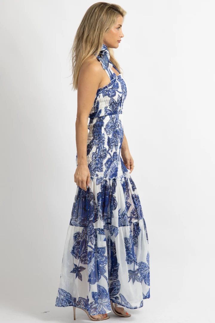 Smocked, Halter tie neck, Maxi length, Tiered ruffle, Floral