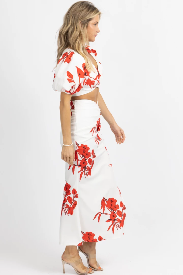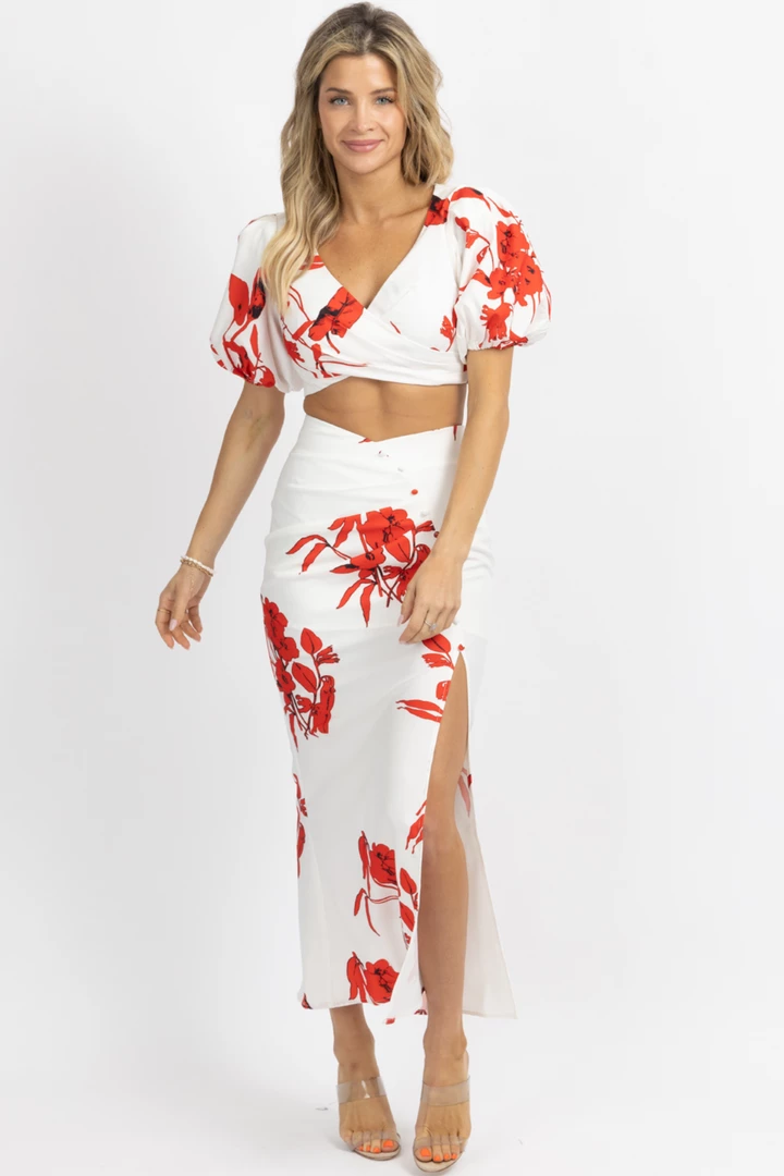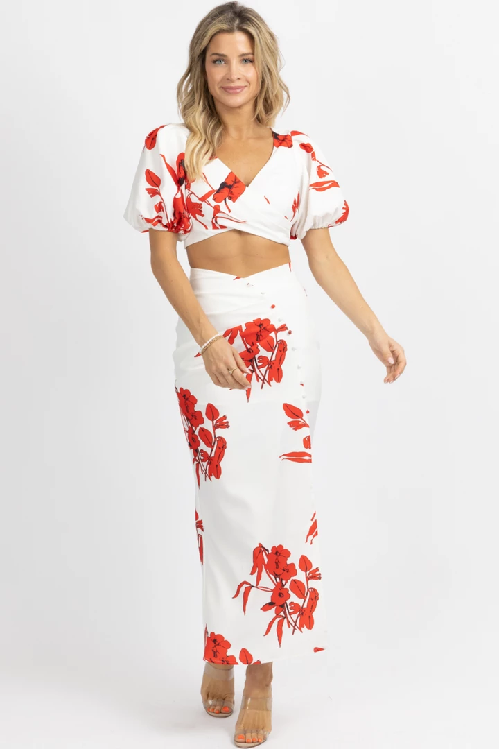 Sold together, Cropped top, Off the shoulder, Puff sleeves, Maxi skirt, Ruffled hem, Button front
