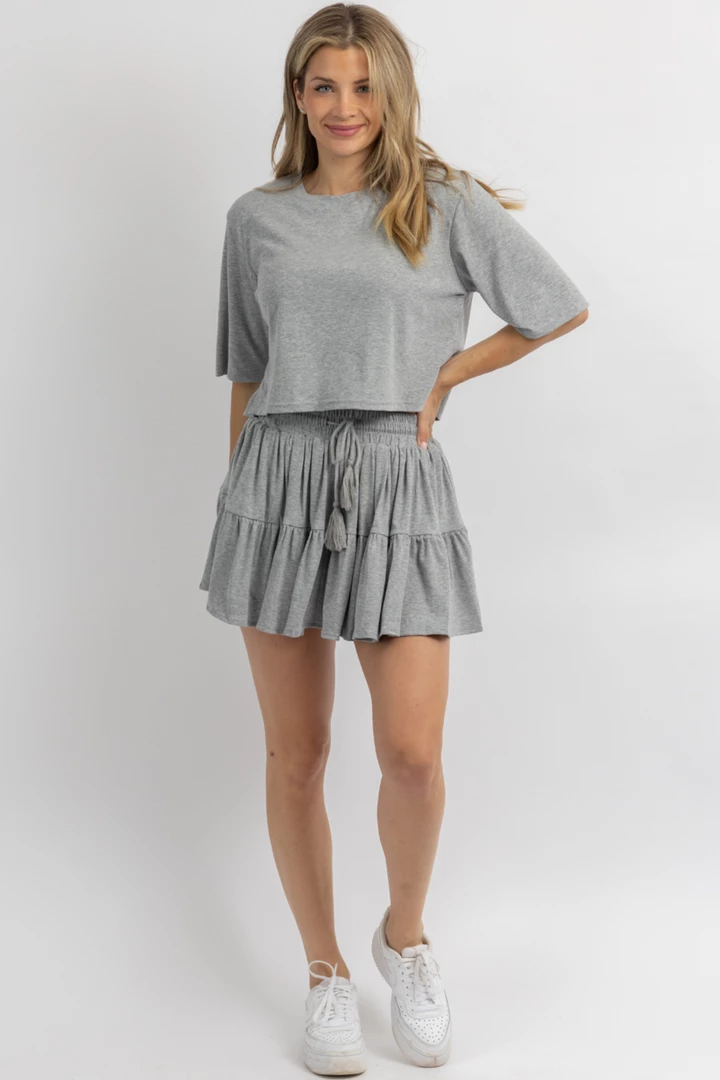 Sold together, Cropped tee, Relaxed fit, Short sleeves, Drawstring waist, Mini skirt with tiered ruffle detail