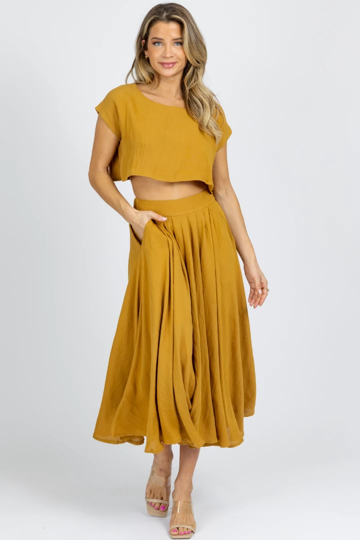 Sold together, Midi skirt, High waisted, Zippered, Cropped short sleeve top, Linenlike, Flowy relaxed fit