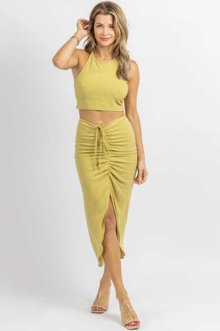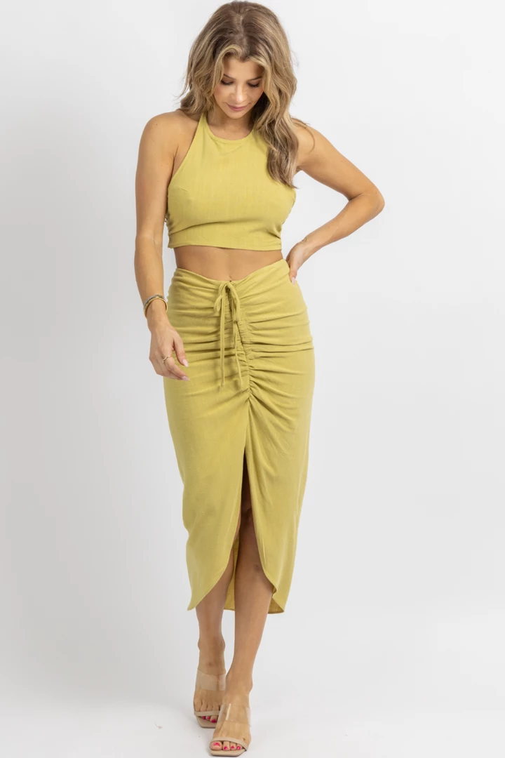 Halter, Backless, Ruched front with drawstring, Sold together, Tie neck and back
