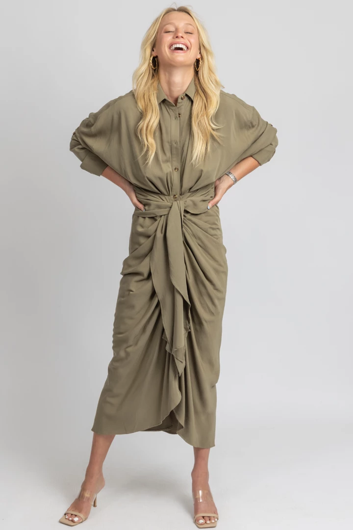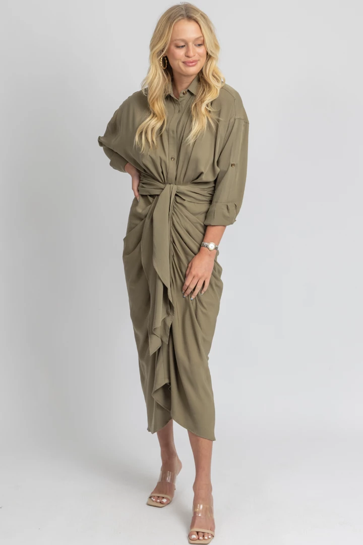 Long sleeves, Twist and tie front, Button down, Collared, Midi length