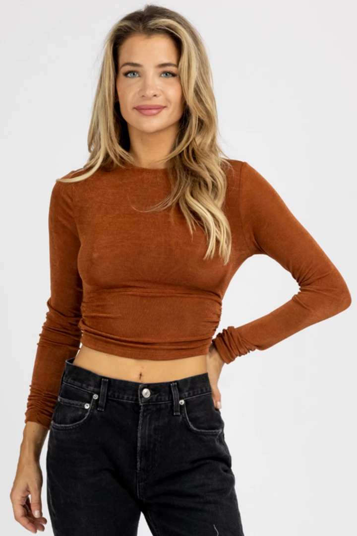 Long sleeves, Open back with tie detail, Cropped, Slinky fitted material, Round neckline