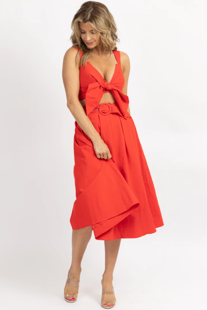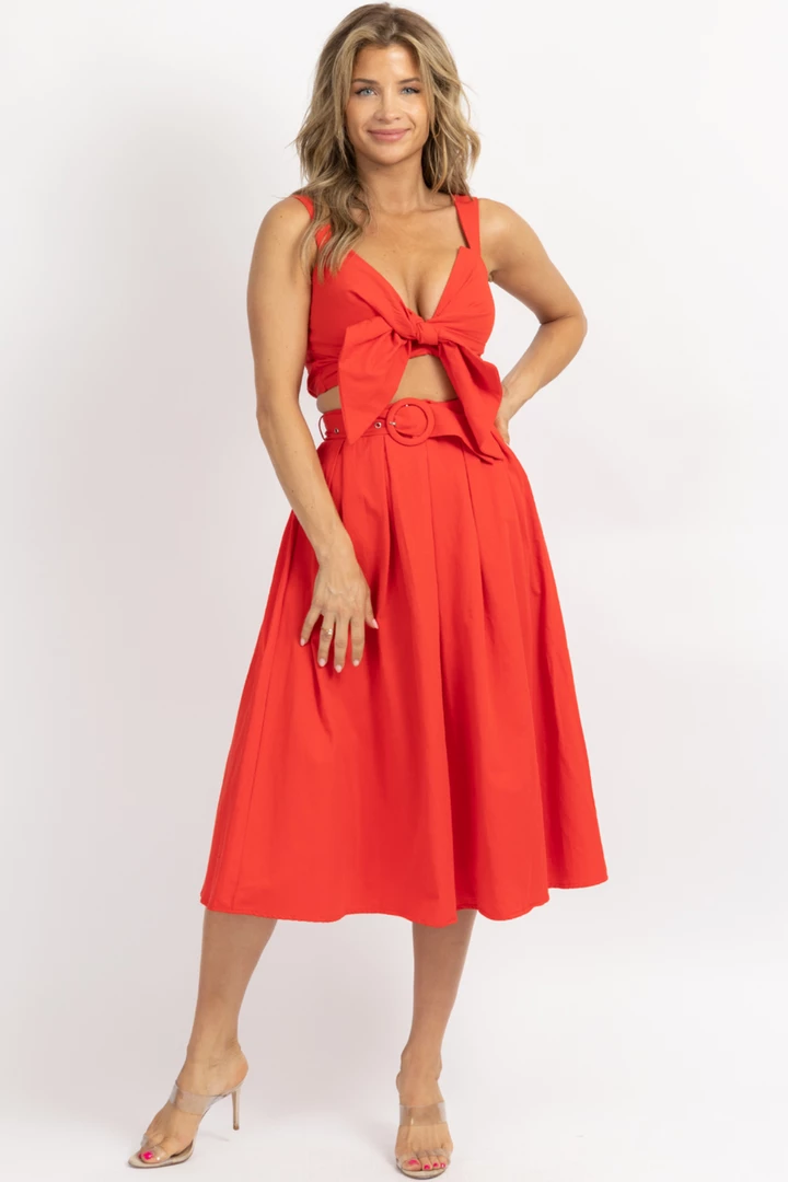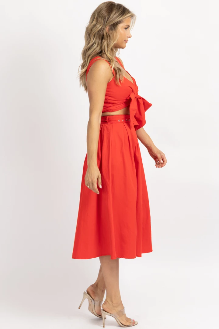 Tie front crop, Flared midi skirt, High waisted, Sold together, Belted