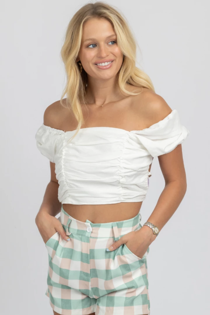 Open back with cross-tie back detail, Cropped, Linen, Puff sleeves, Short sleeves, Shirring