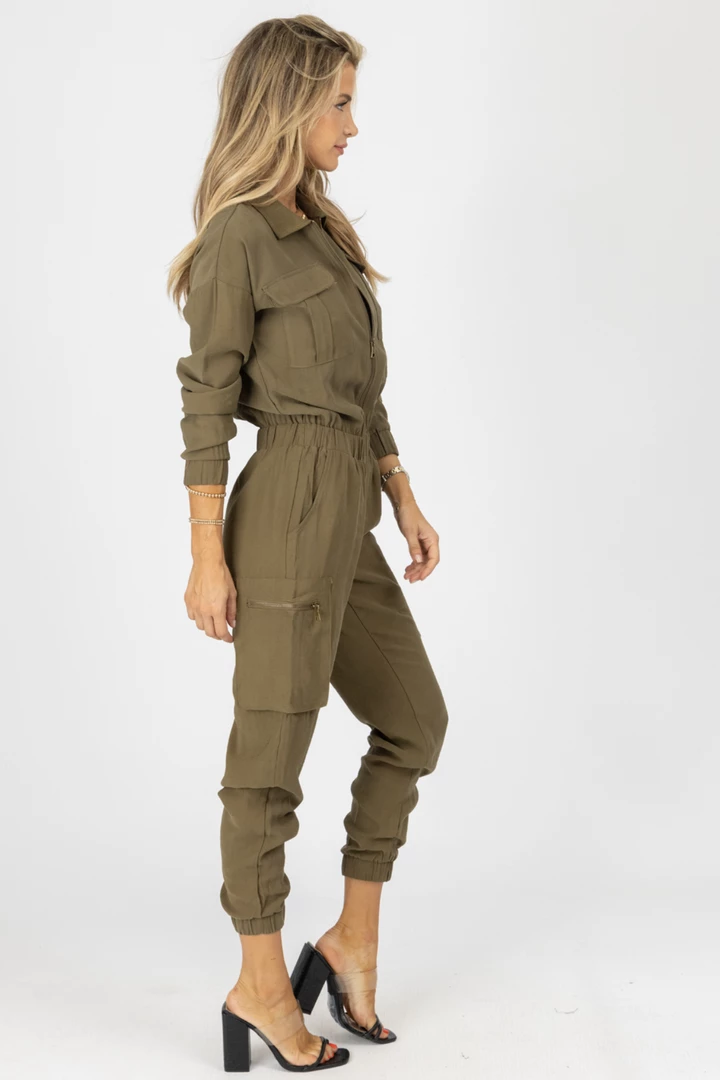 Cargo pocket detail on front, Side leg pockets, Drawstring waist, Zip front, Collared, Long sleeves