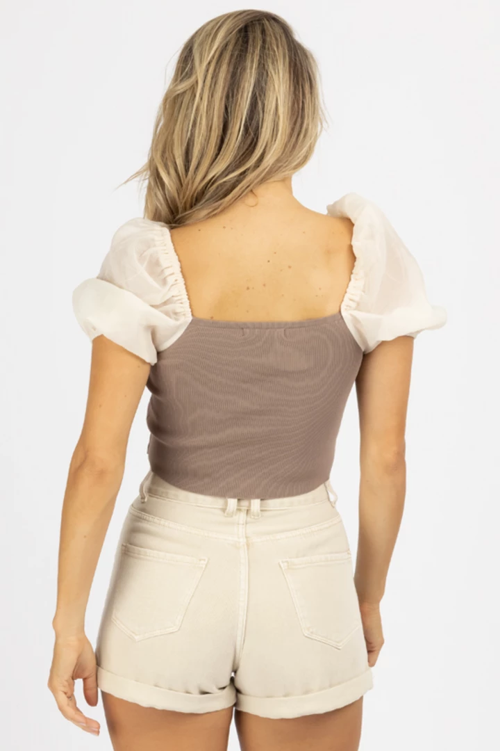 Cropped, Puff sleeves, Sheer sleeves, Brown + cream contrast