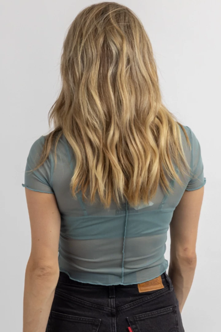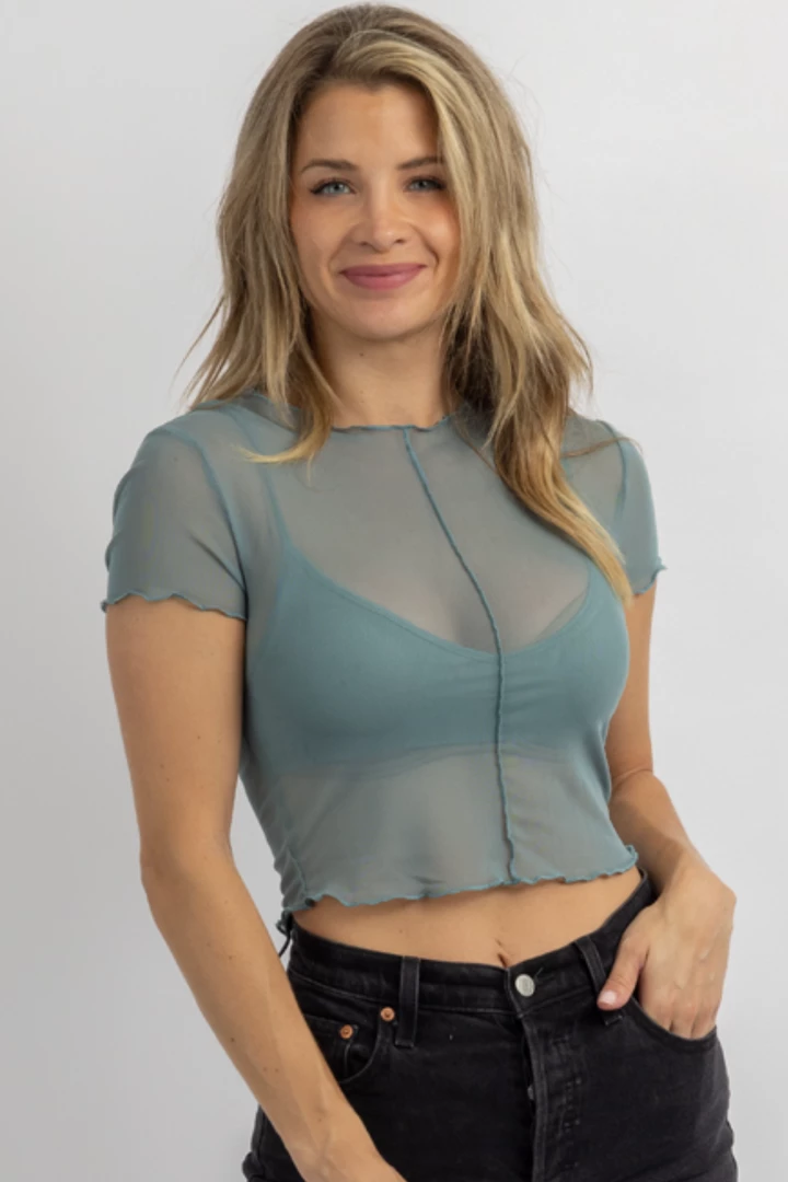 Cropped, Built in tank top with sheer overlay, Short sleeves, Outseam detailing
