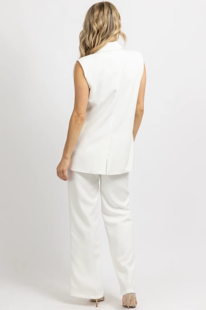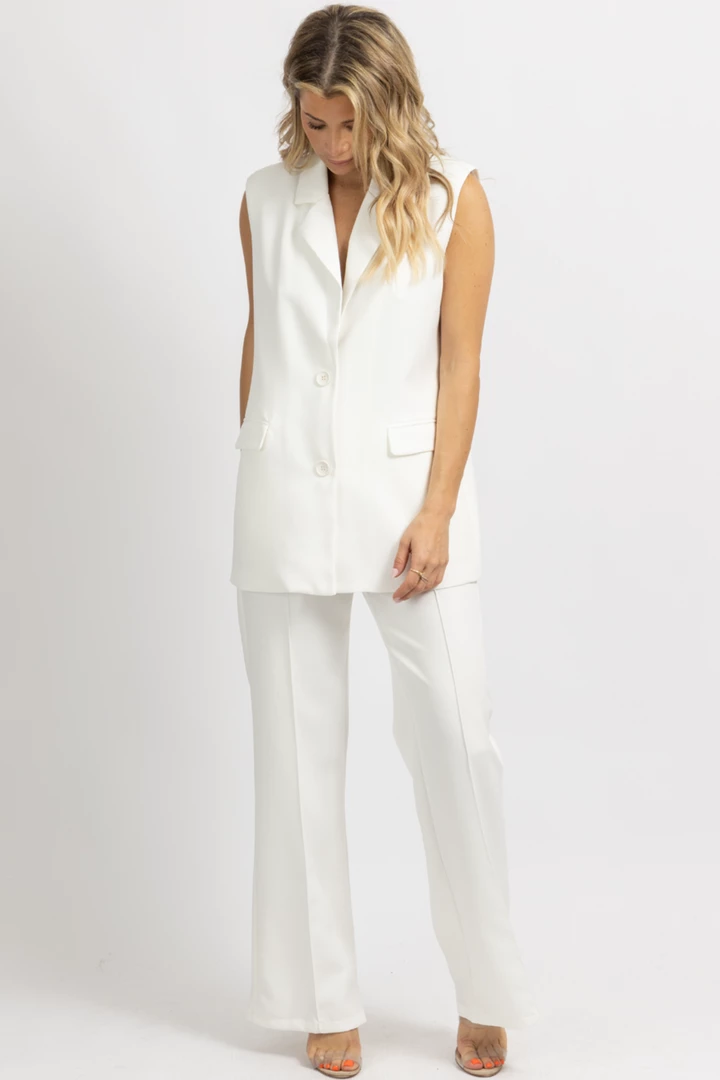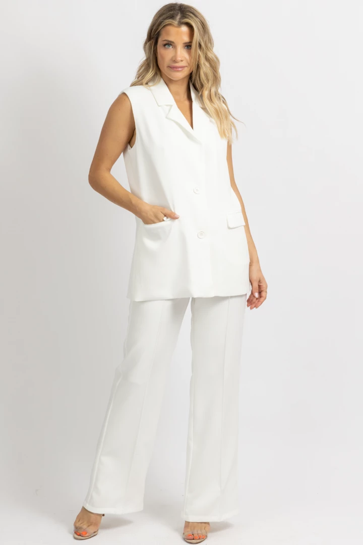 Sold together, Oversized vest, Sleeveless, Button front, High rise pant, Fit + flare