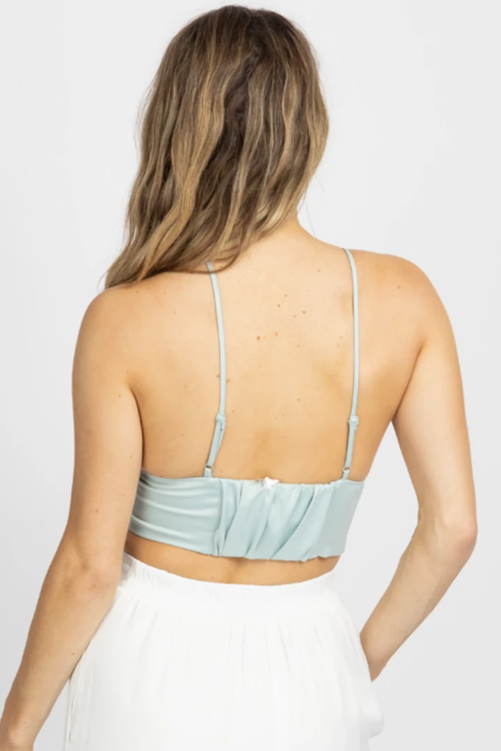 Adjustable spaghetti straps, Satin, Cropped, V-neck, Ruched back
