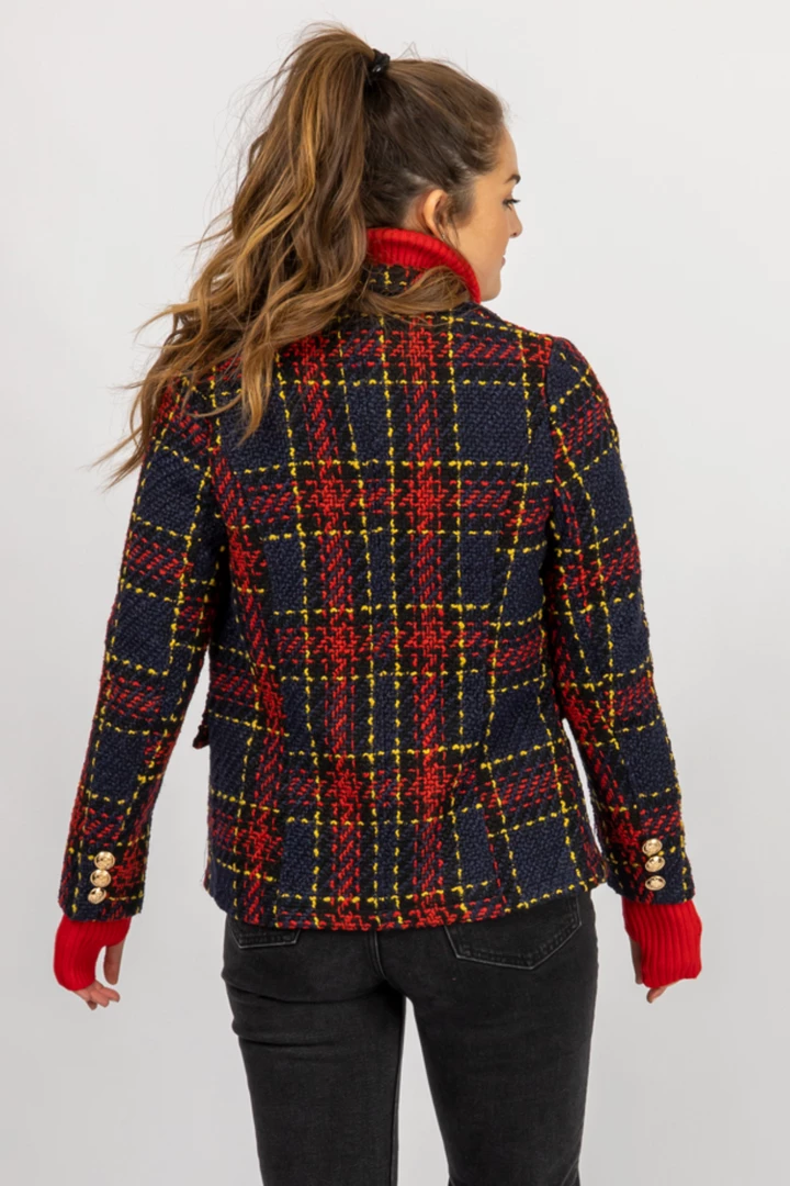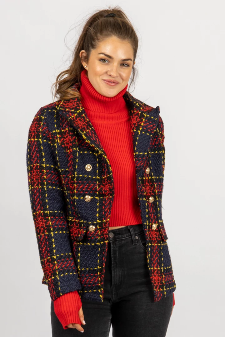Front buttons, Buttoned sleeve detail, Plaid print, Tweed