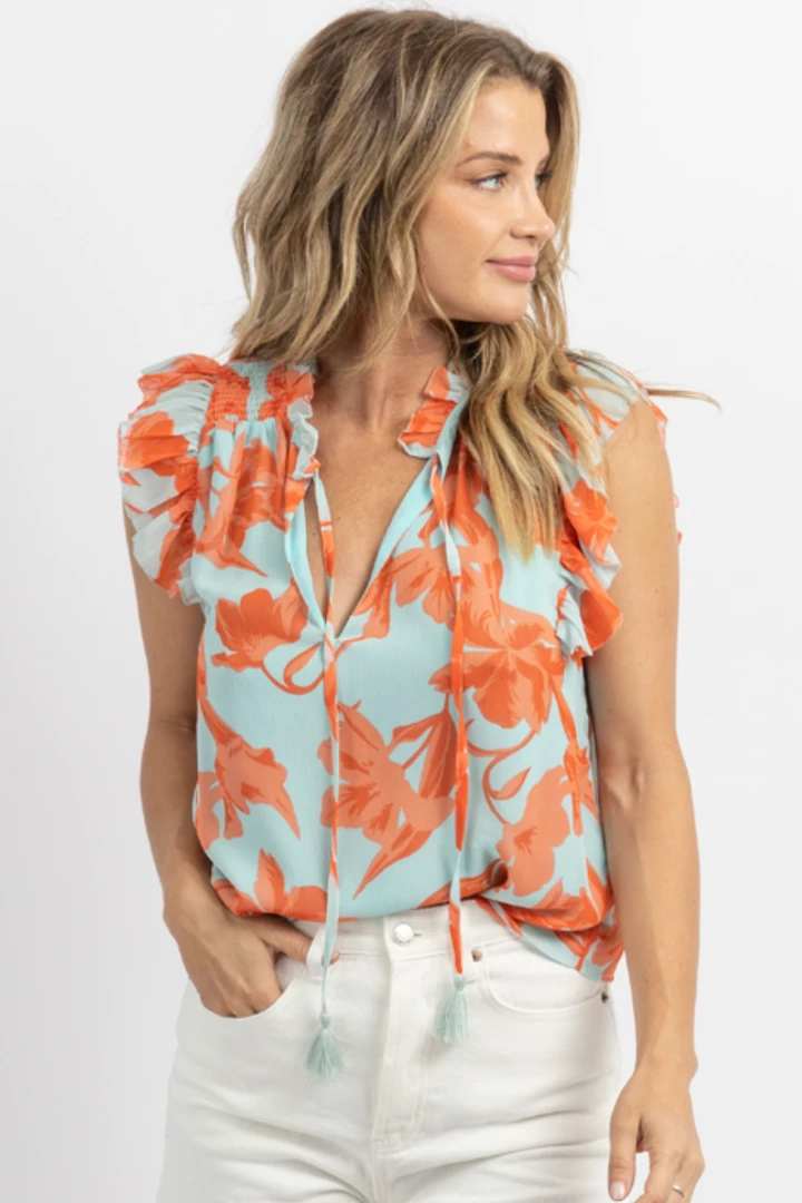 Ruffled, Sleeveless, V-neckline, Drawstrings, Floral