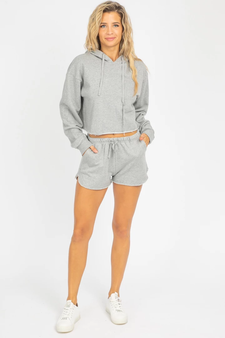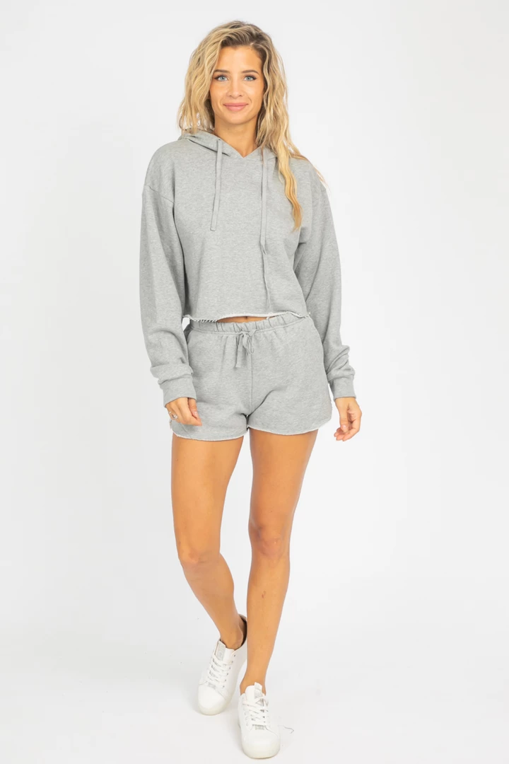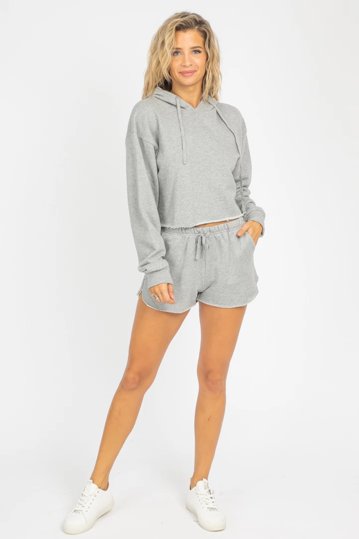 Hooded drawstring pullover with a raw cut hem and drawstring shorts