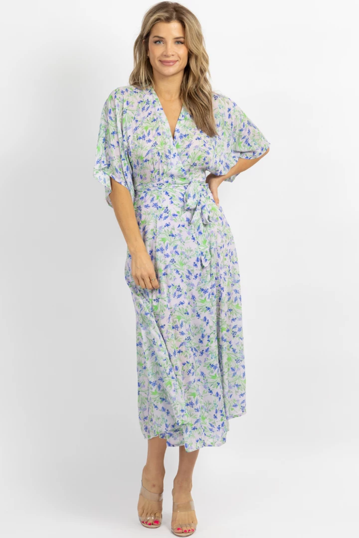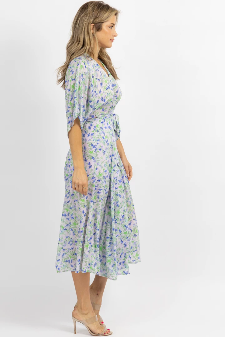Midi length, Self tie, Wrapped, Asymmetric, Short sleeves, Floral