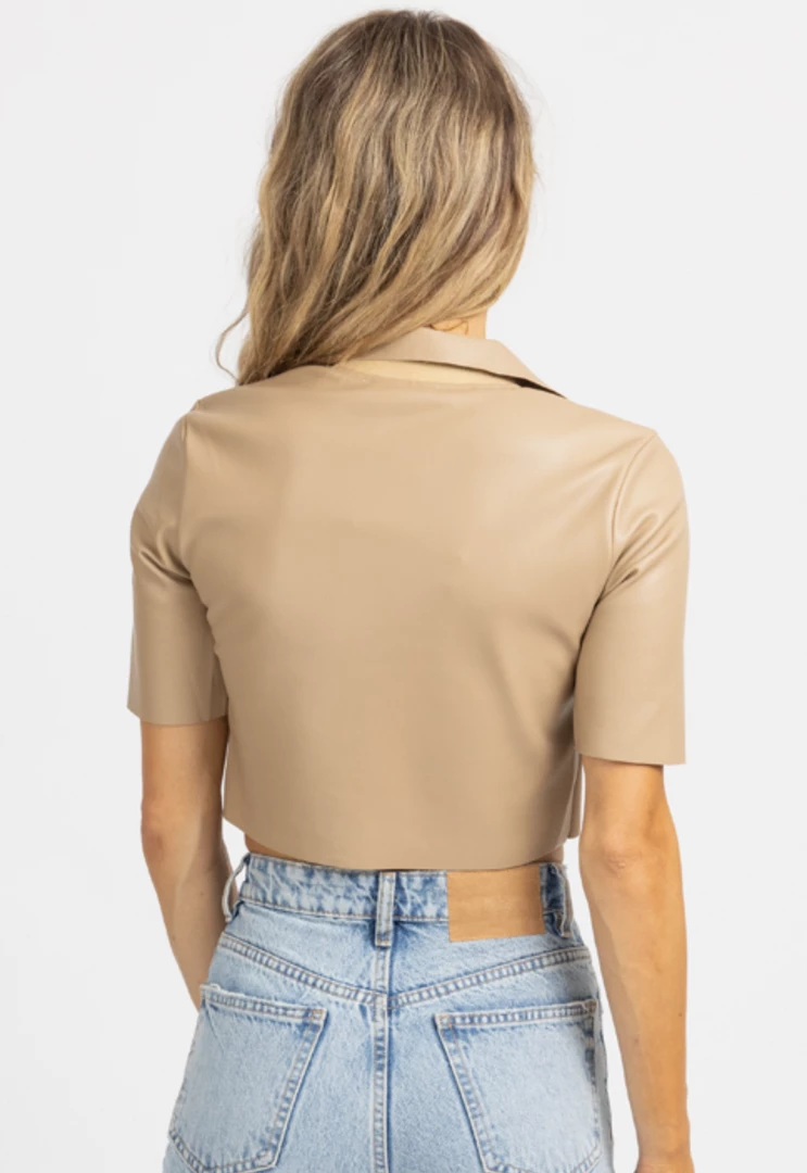 Faux leather, Cropped, Collared, Short sleeves, Button front