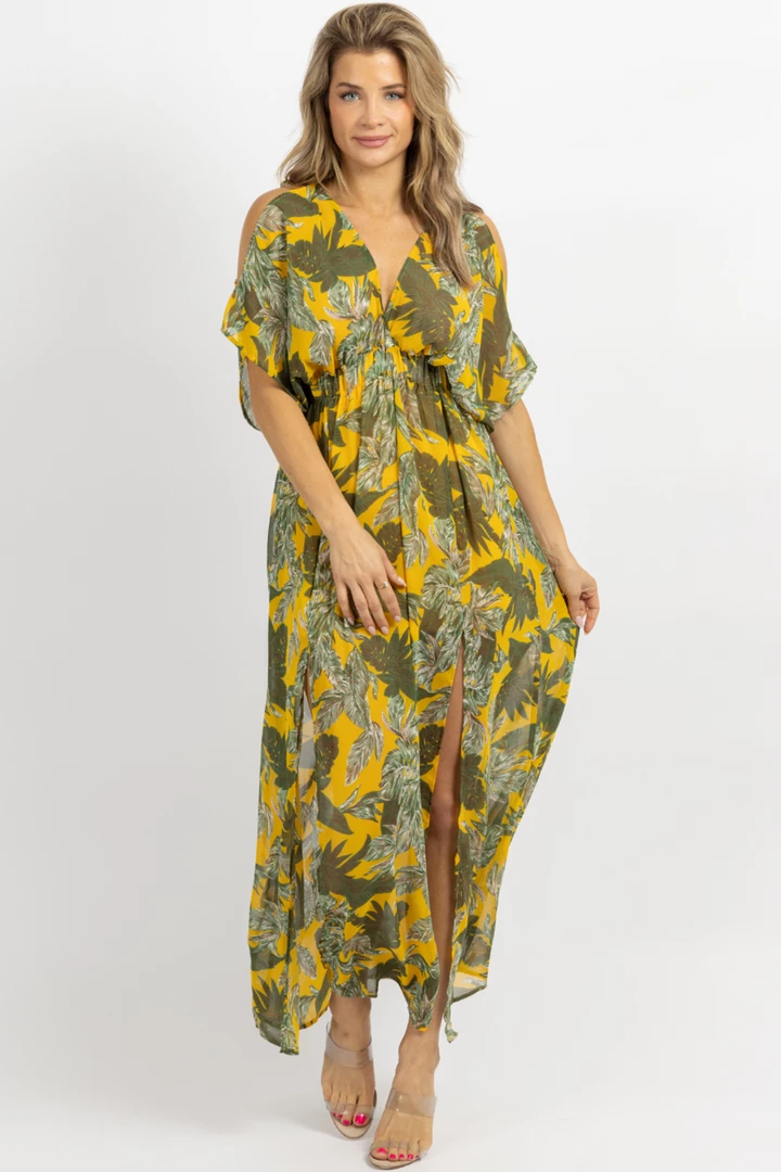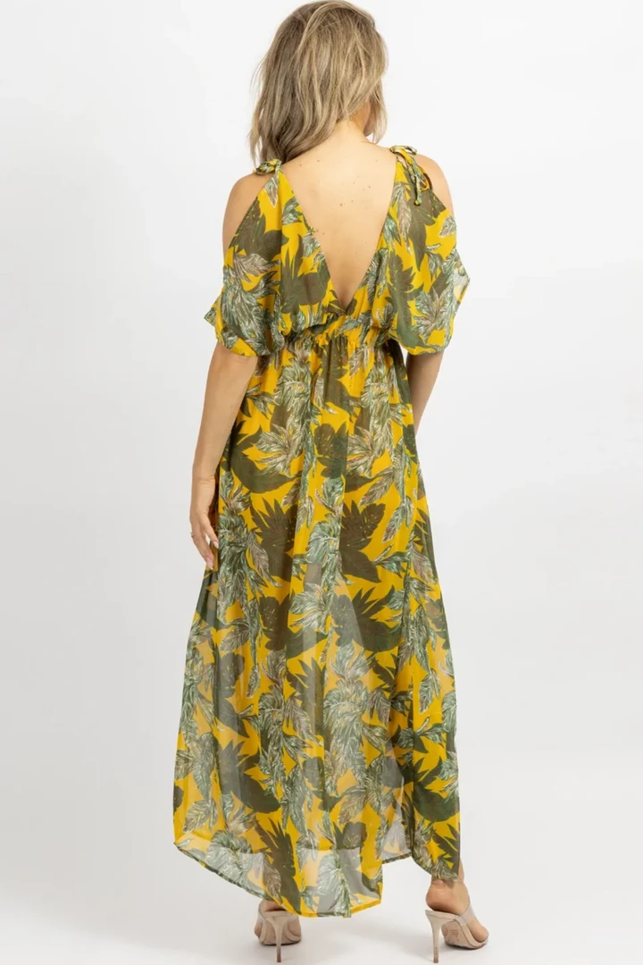 Deep v front + back, Ruched elastic waist, Cold shoulder detail, Slits, Maxi length, Palm print, Short sleeve
