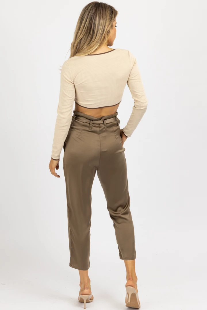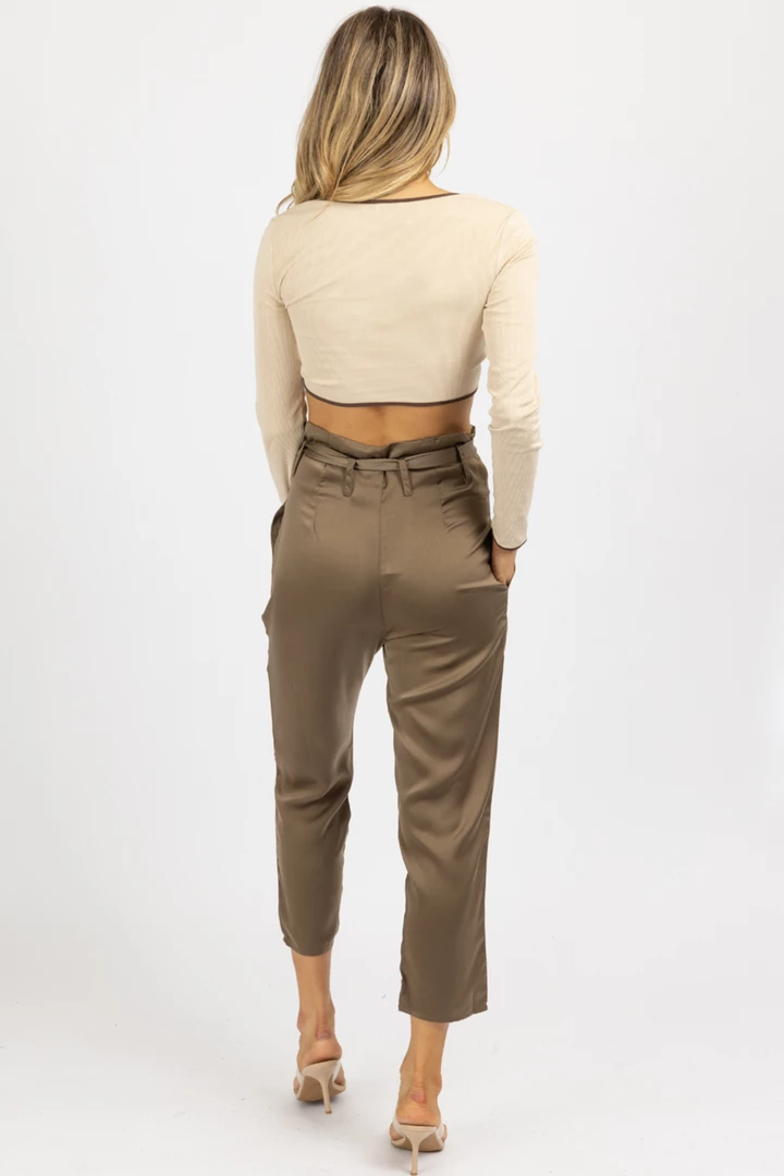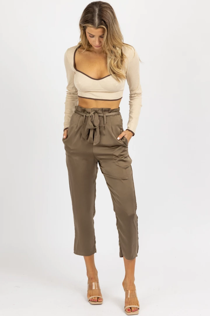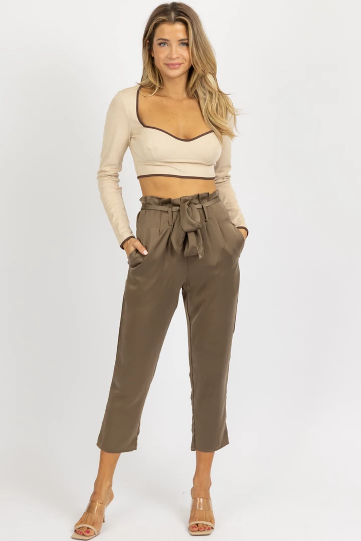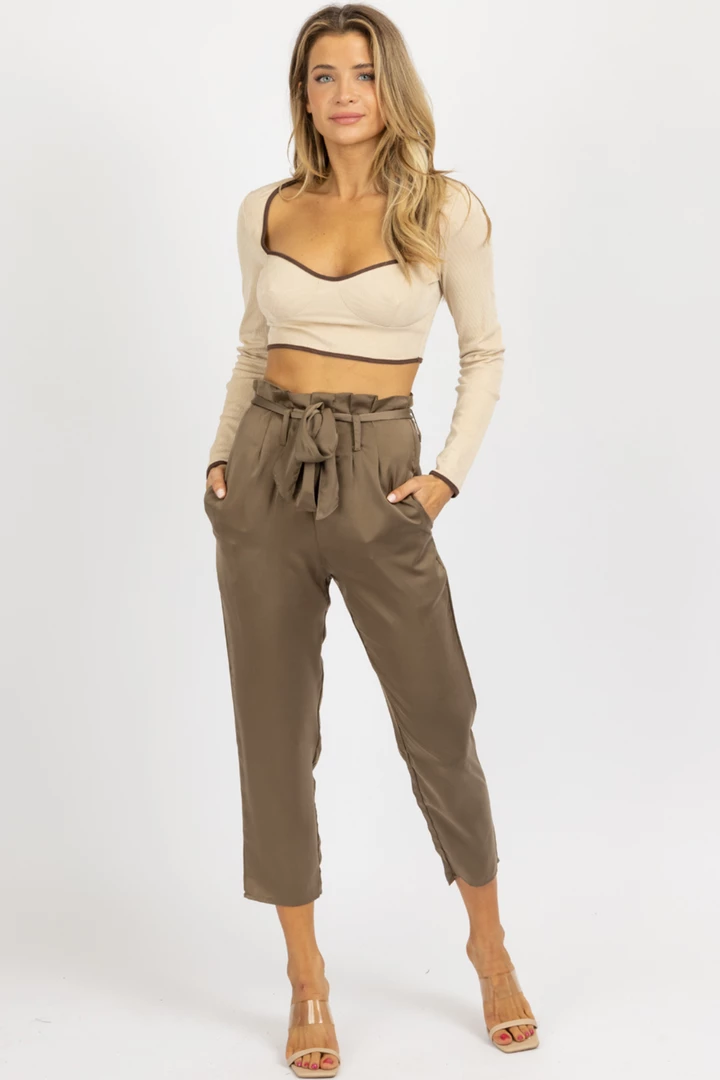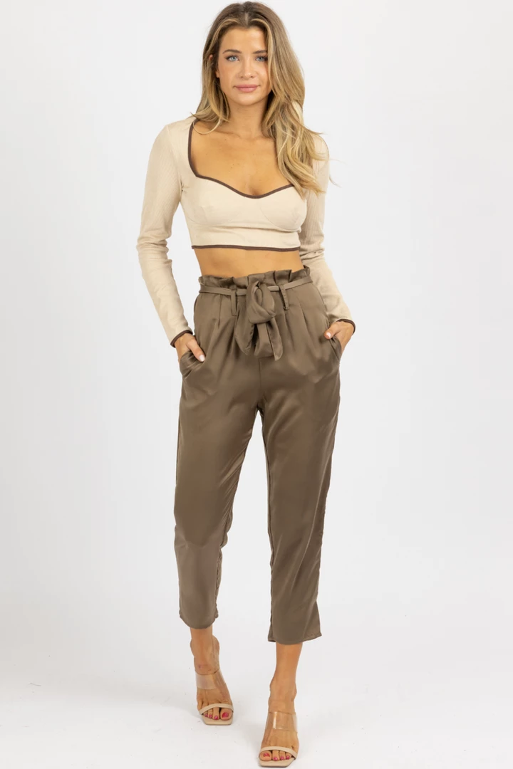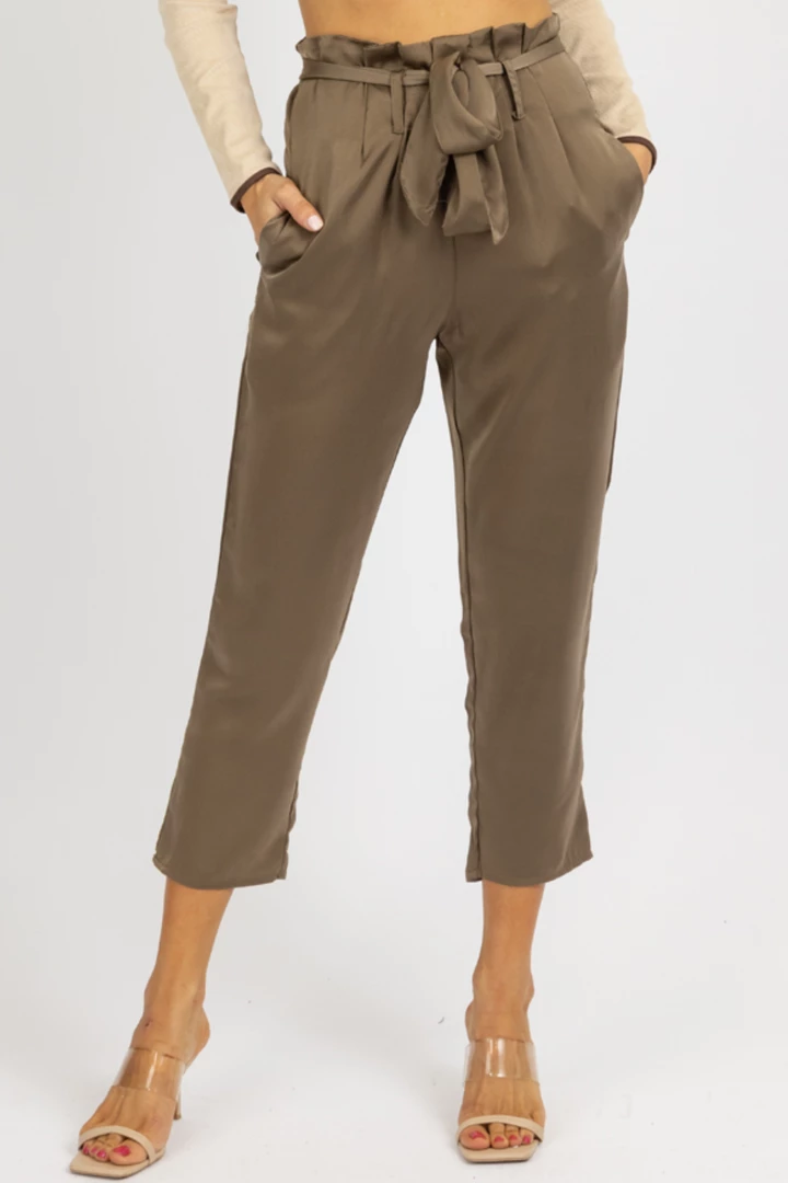 High waisted, Front pleats, Tie front, Satinlike, Side pockets