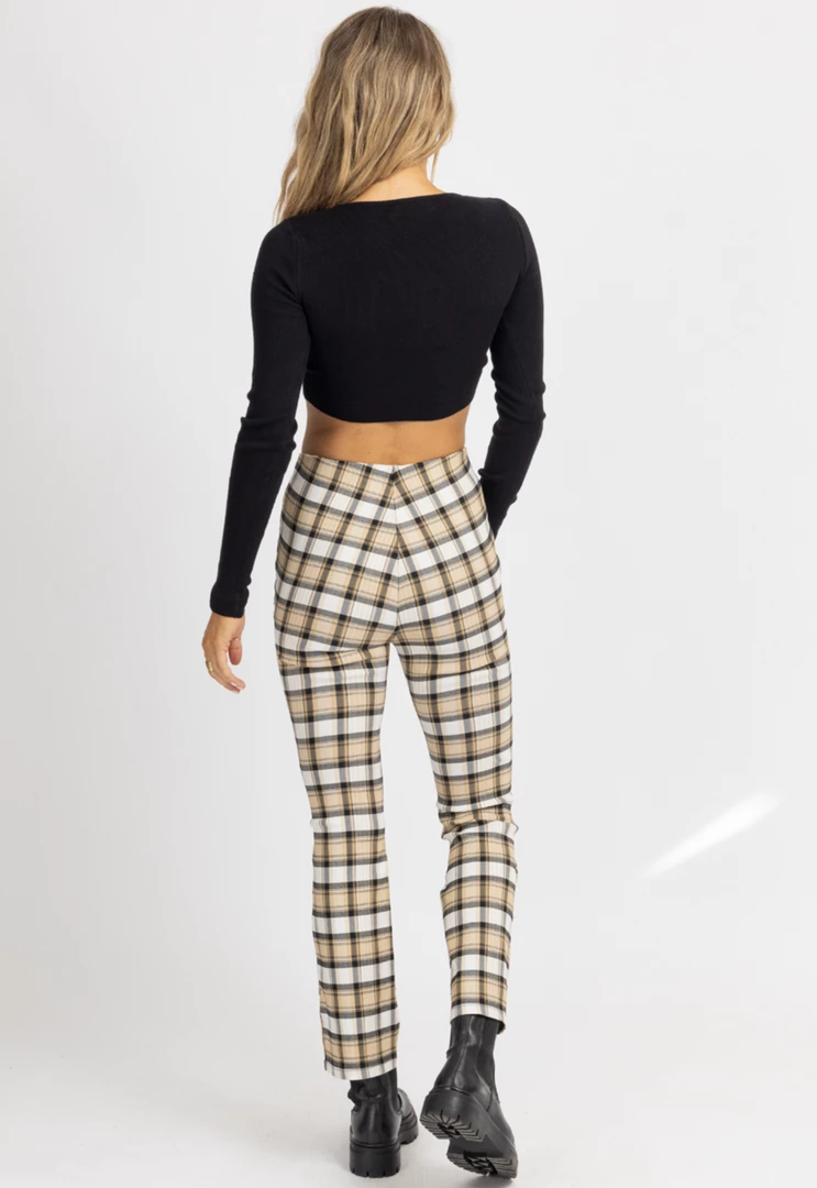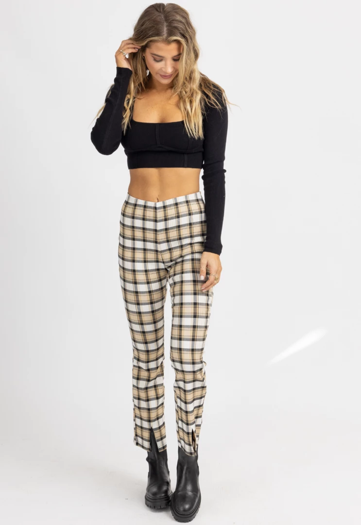 Tan plaid print, Stretch, High rise, Flare pant with front slit detail, Slight crop