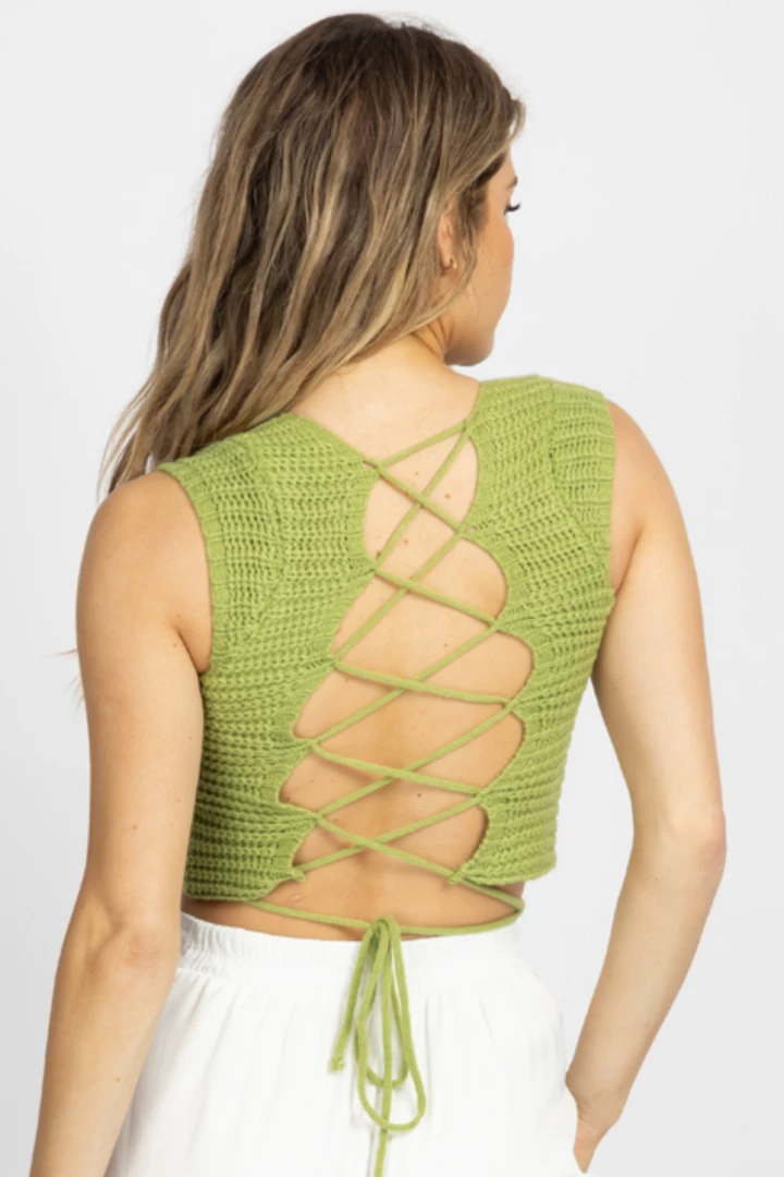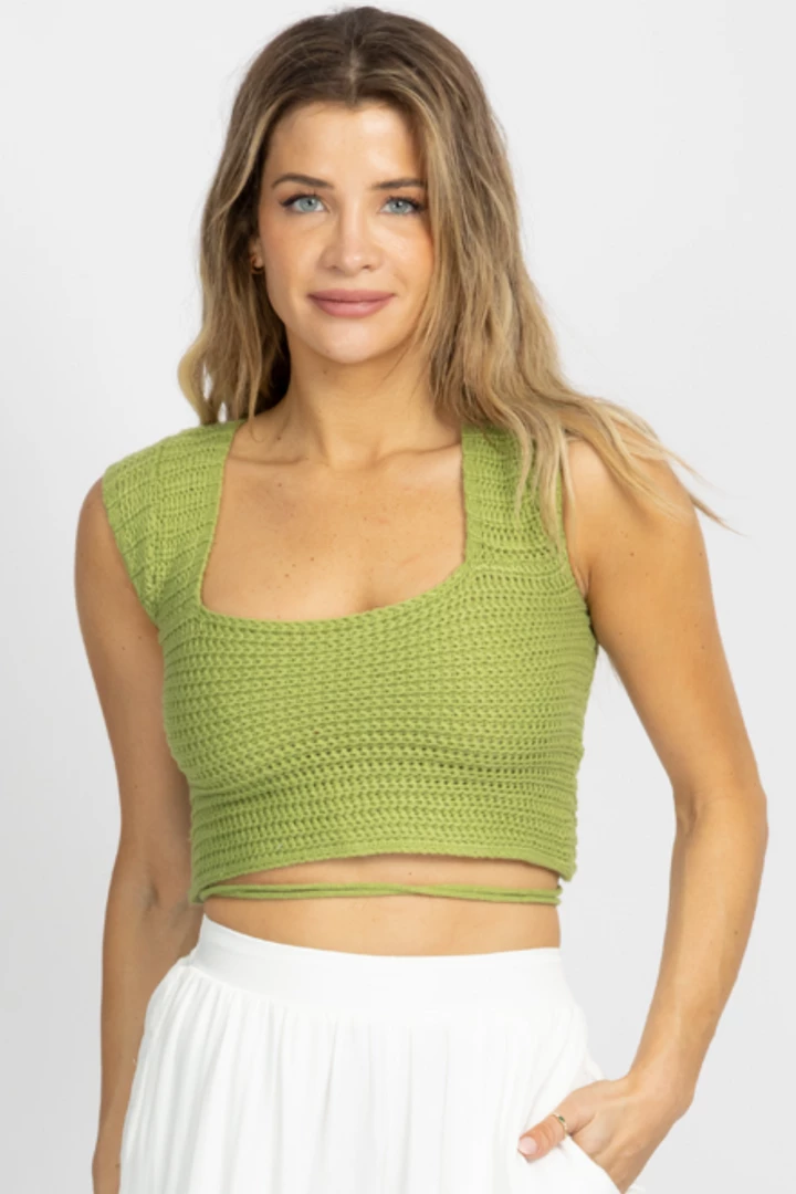 Sleeveless, Squareneck, Cropped, Knit throughout, Cross-tie back detail