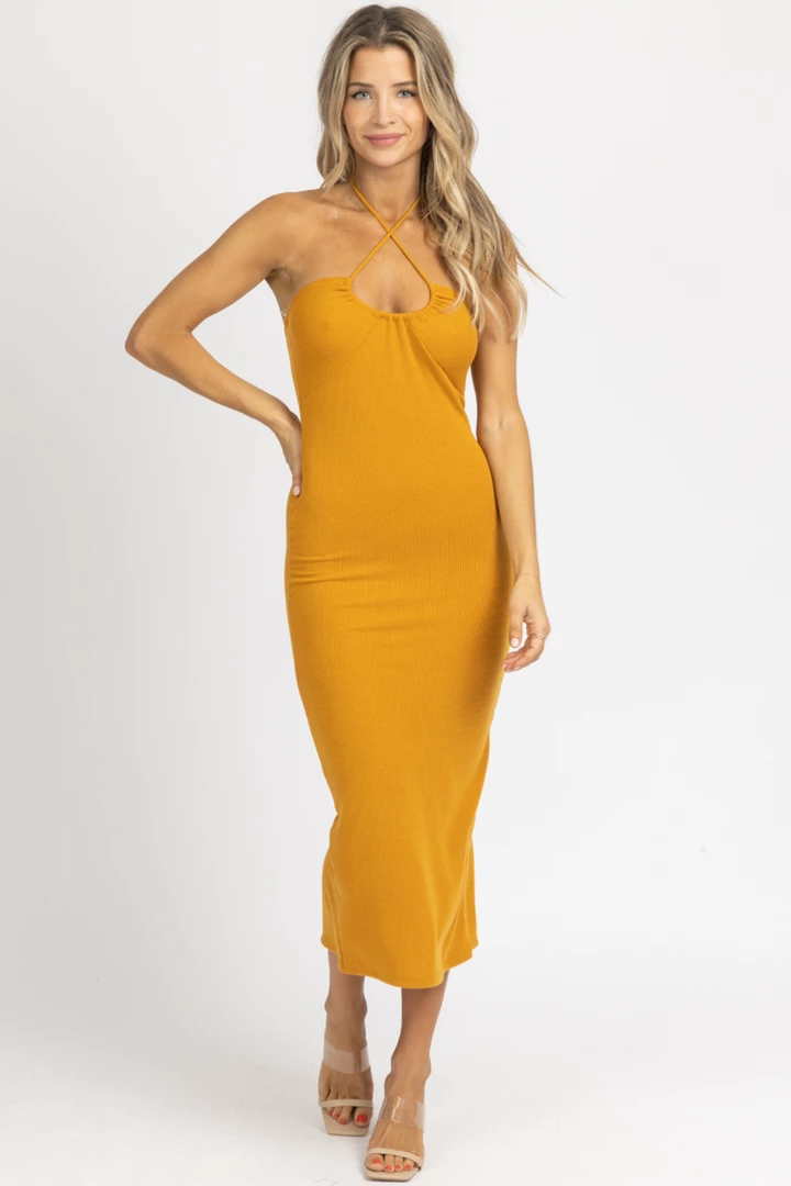 Fitted, Midi length, Ribbed, Halter tie neck, Round neck