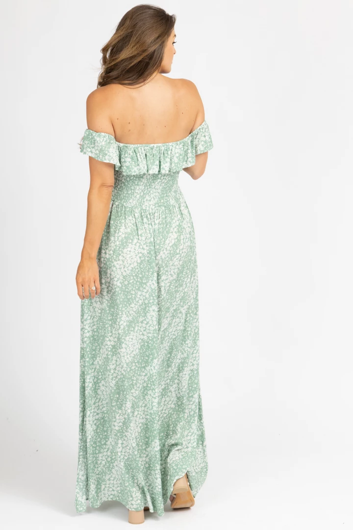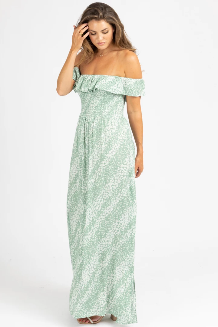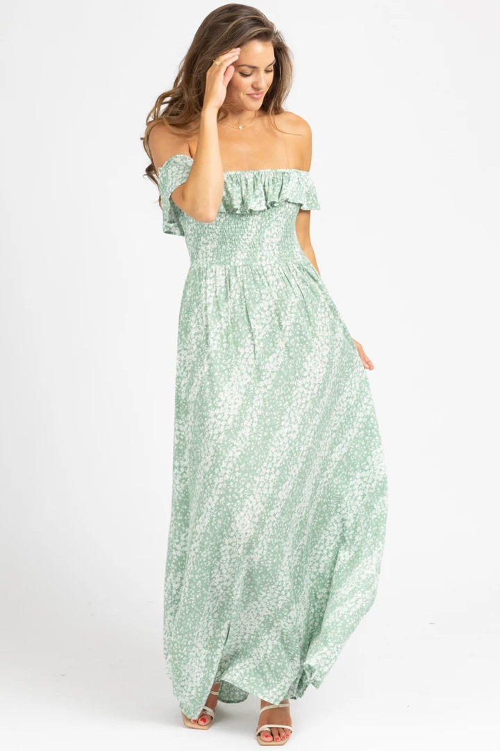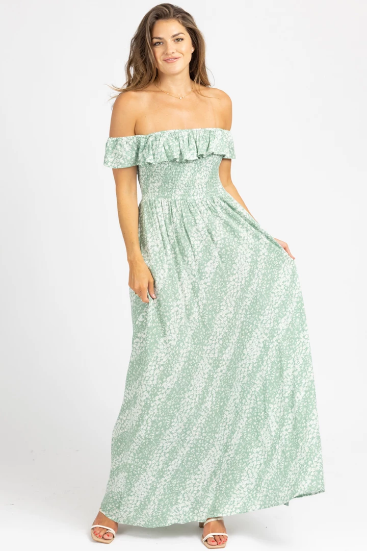 Ruffle off shoulder neckline, Smocked, Floral, Maxi
